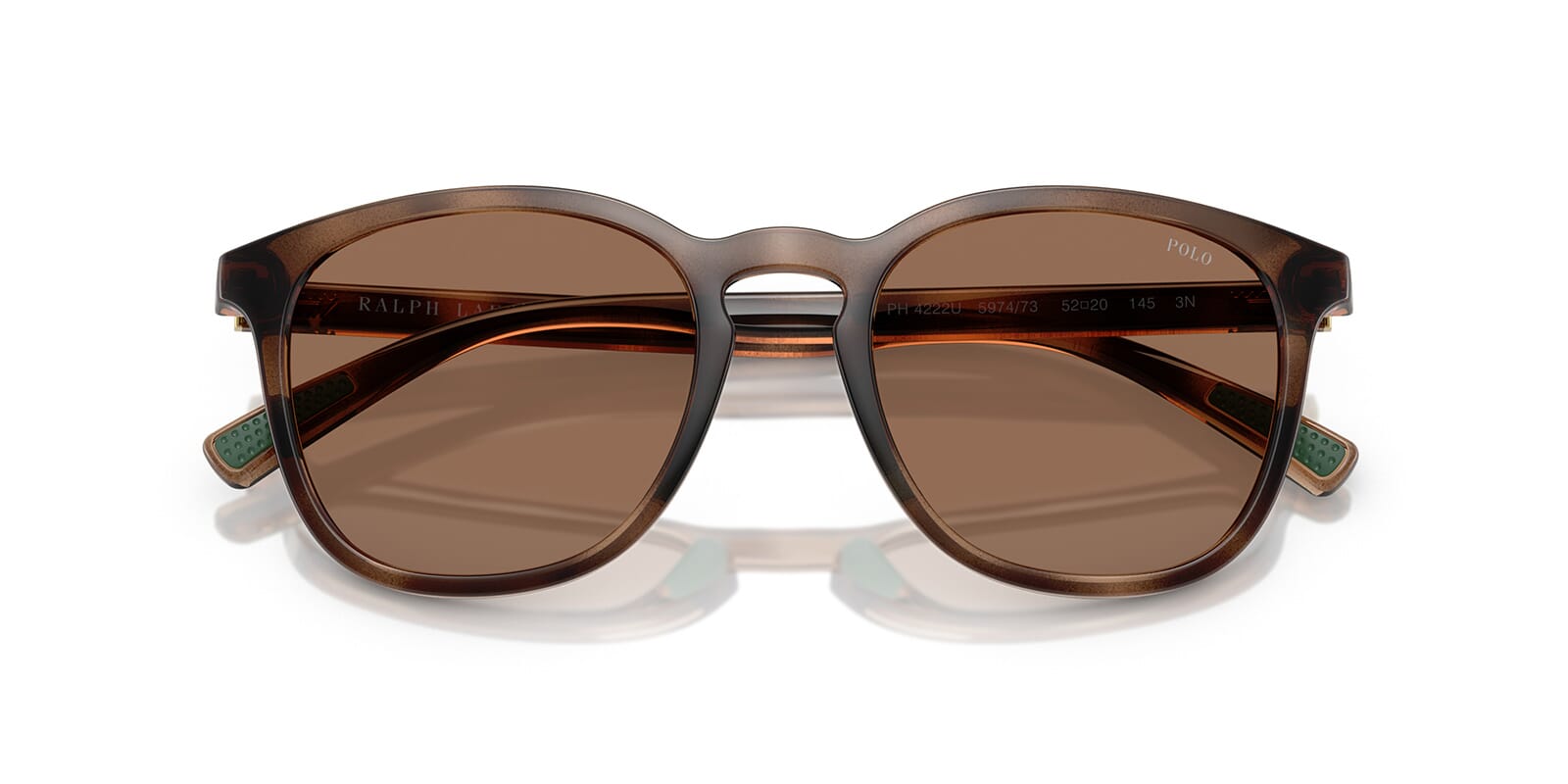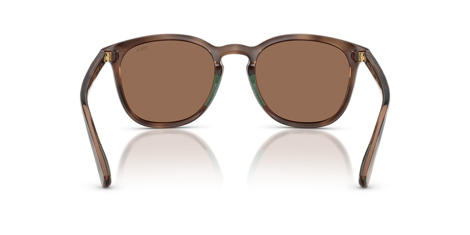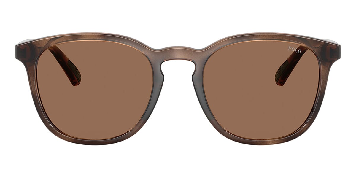 This round Polo sunglass comes in a shiny dark havana frame with dark brown lenses.
