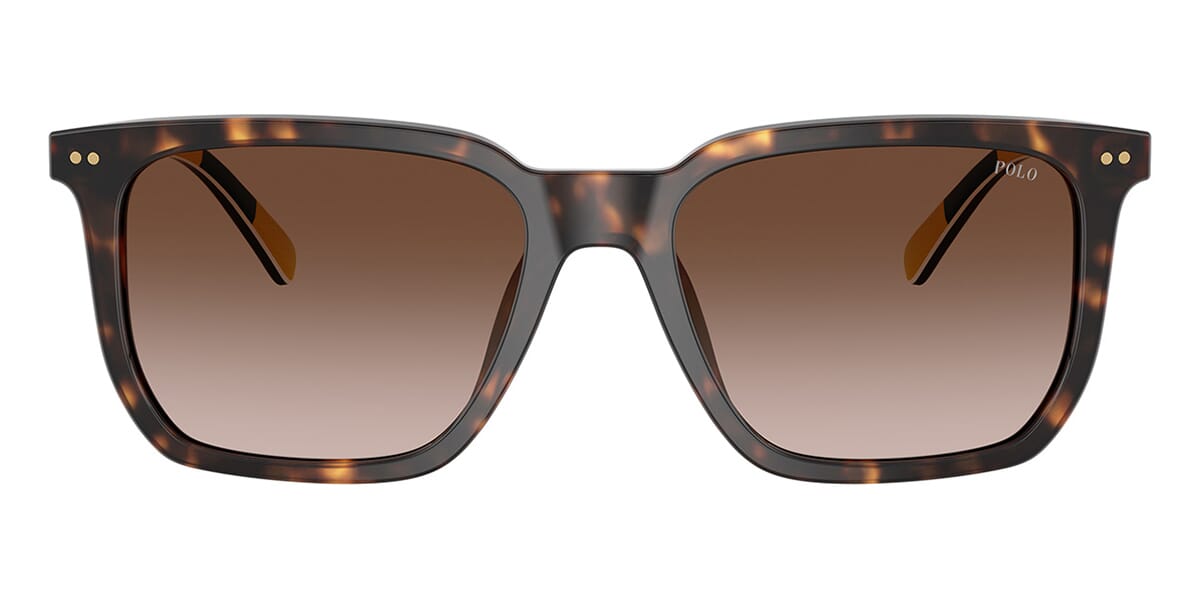 This square Polo sunglass comes in a shiny dark havana frame with dark brown gradient lenses.