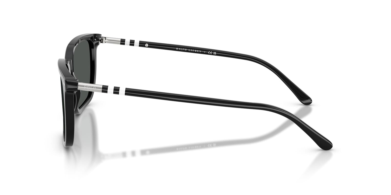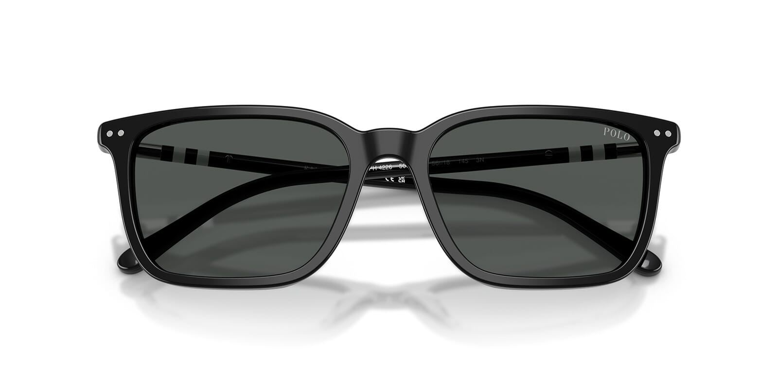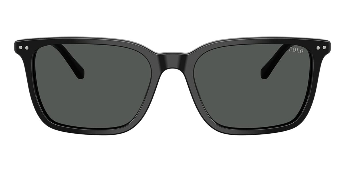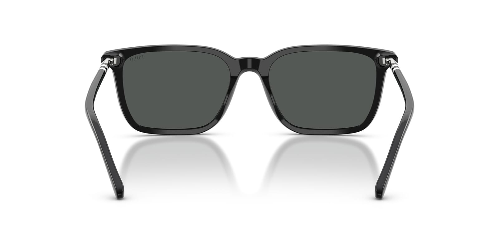 This square Polo sunglass comes in a shiny black frame with dark grey lenses.