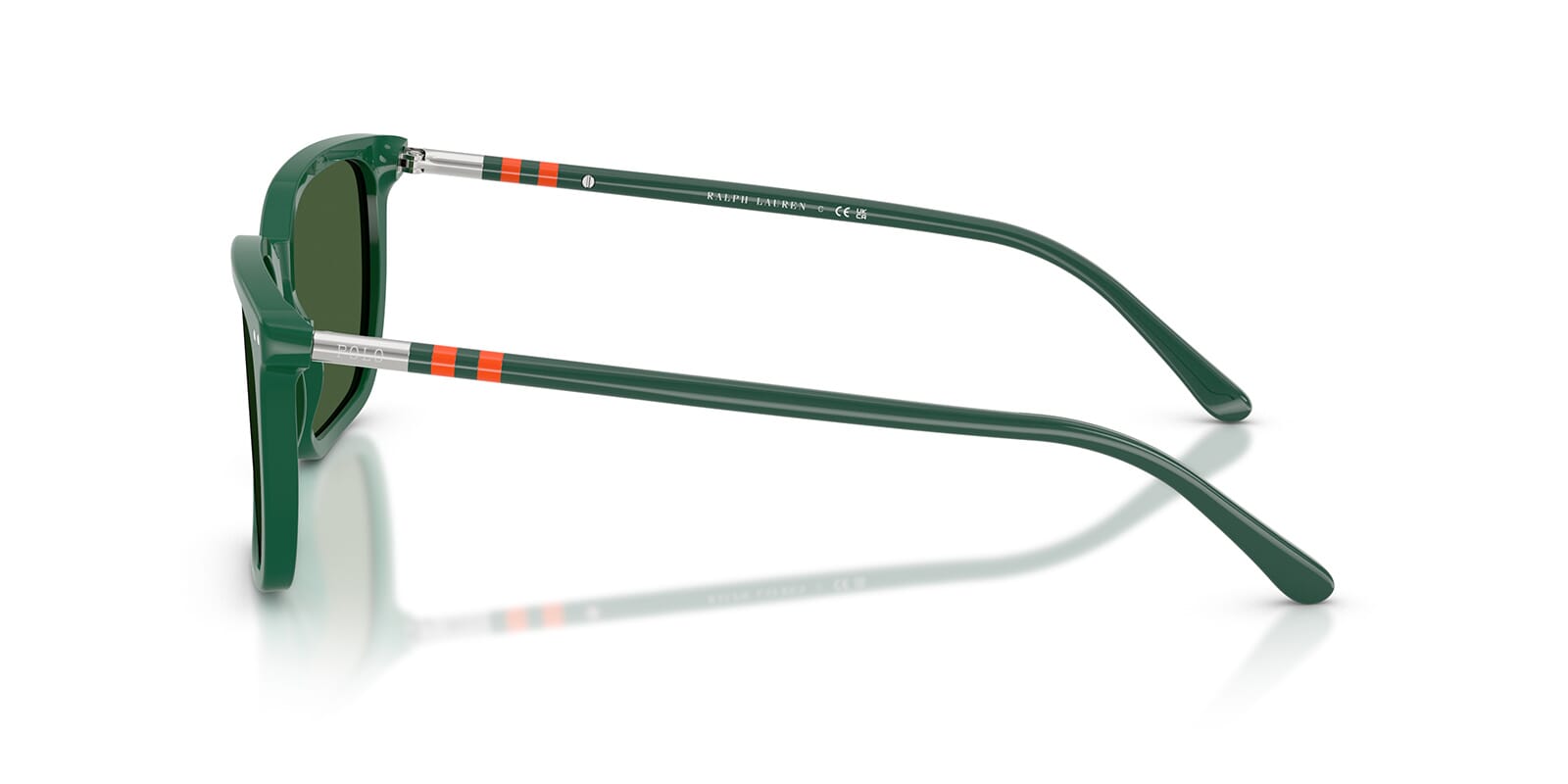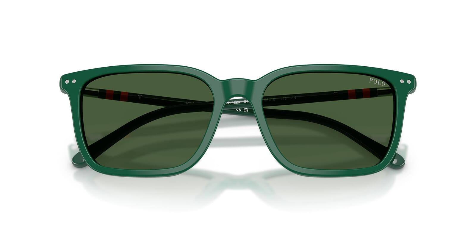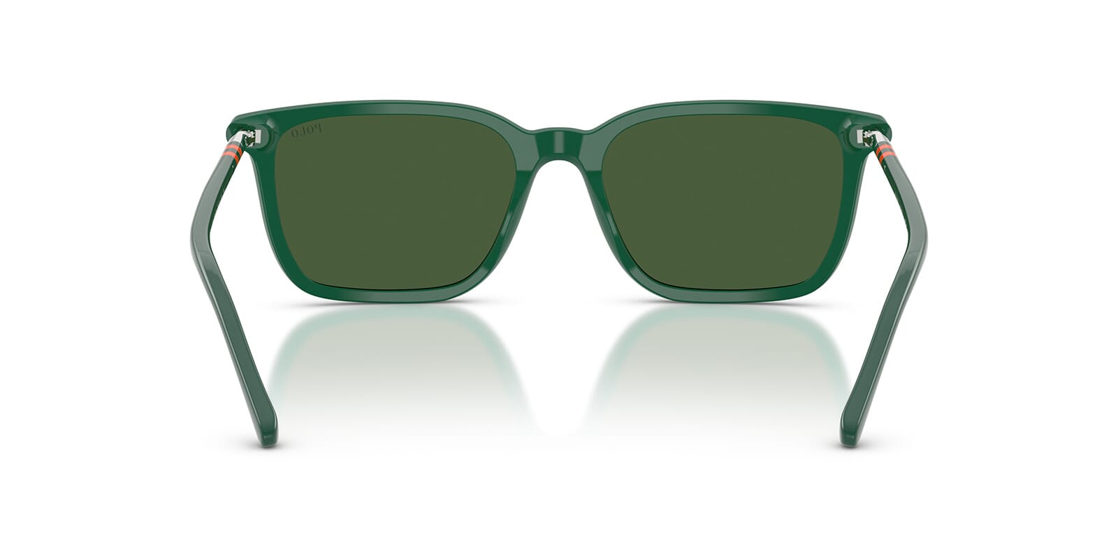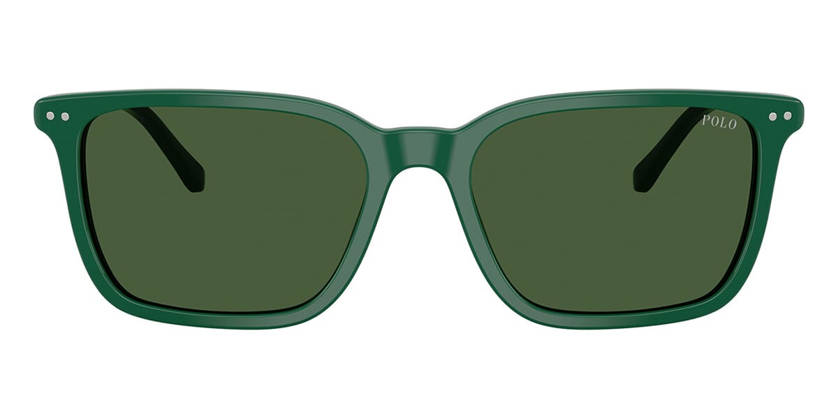 This square Polo sunglass comes in a shiny green frame with bottle green lenses.