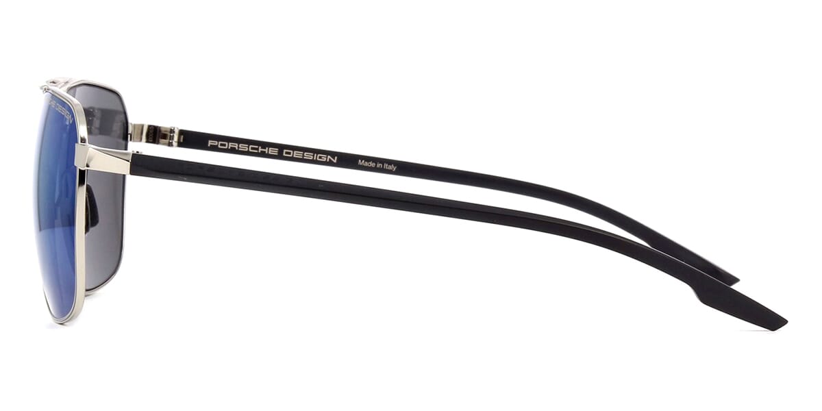 This square Porsche Design sunglass comes in a shiny silver and black frame with grey smoke with blue mirror lenses.