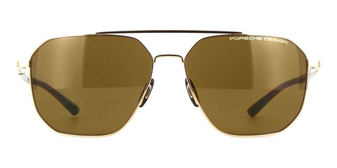 This square Porsche Design sunglass comes in a shiny gold frame with brown with light mirror lenses.