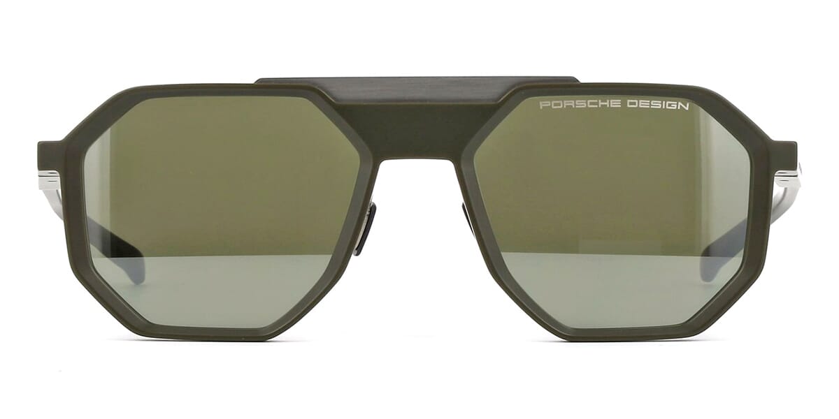 This square Porsche Design sunglass comes in a jet green frame with green with silver mirror lenses.