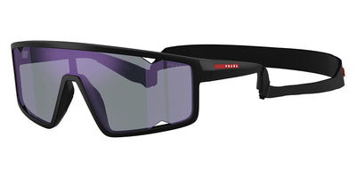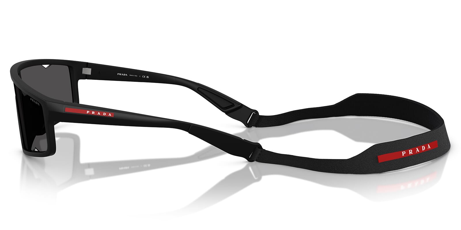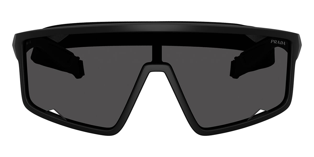 This shield Prada Linea Rossa sunglass comes in a matte black frame with dark grey lenses.