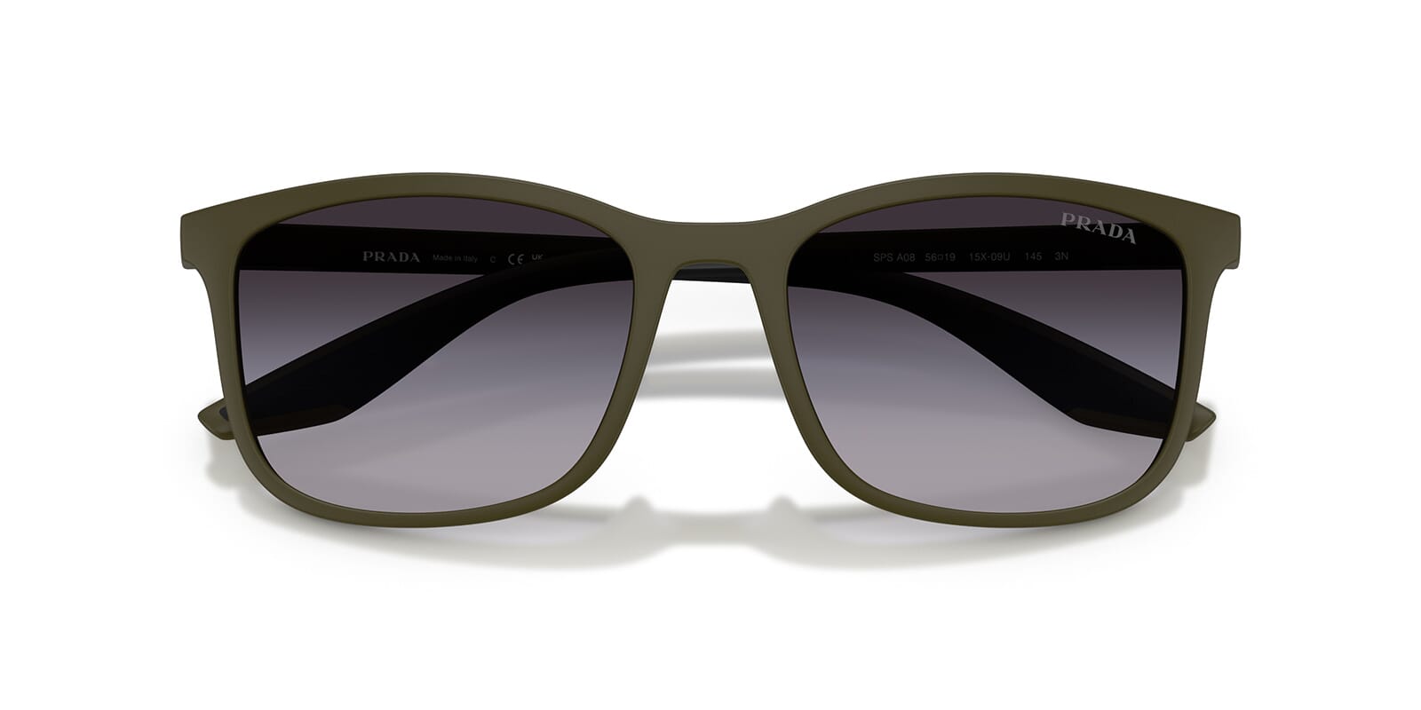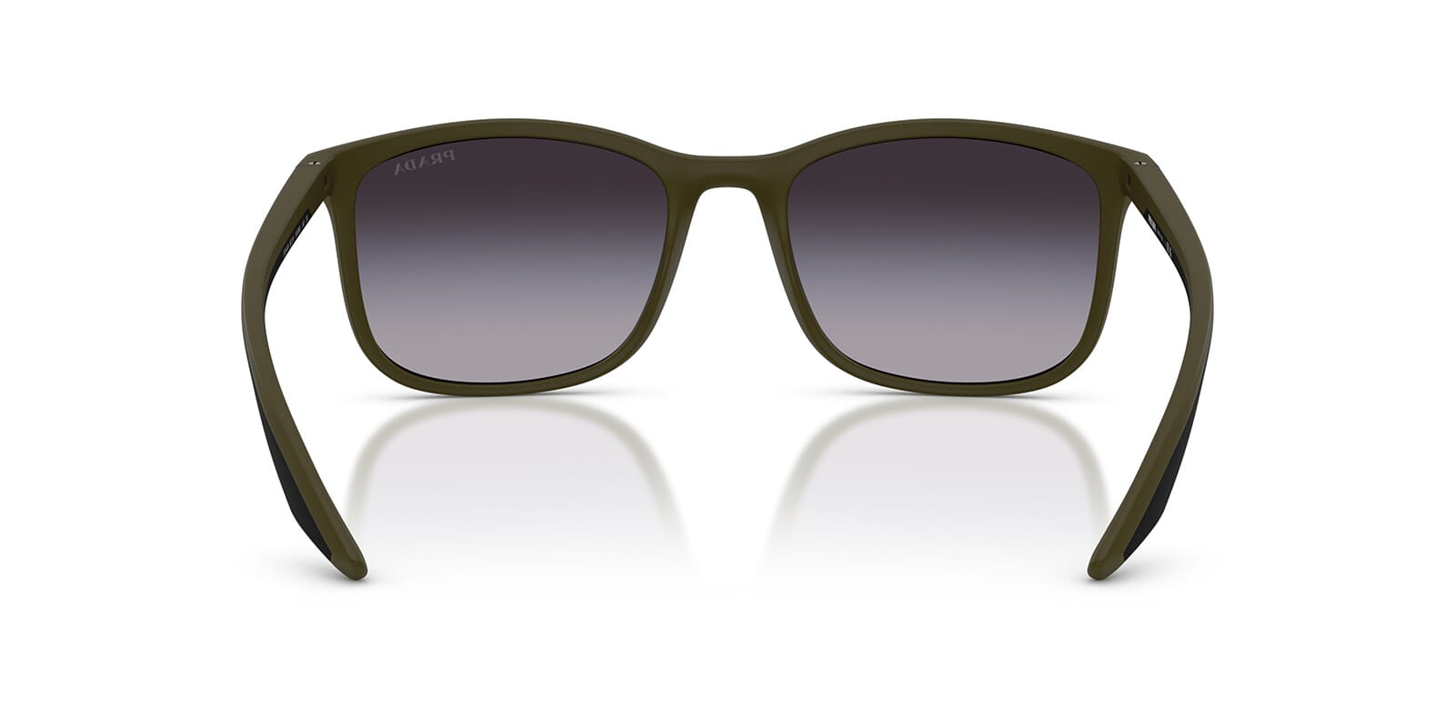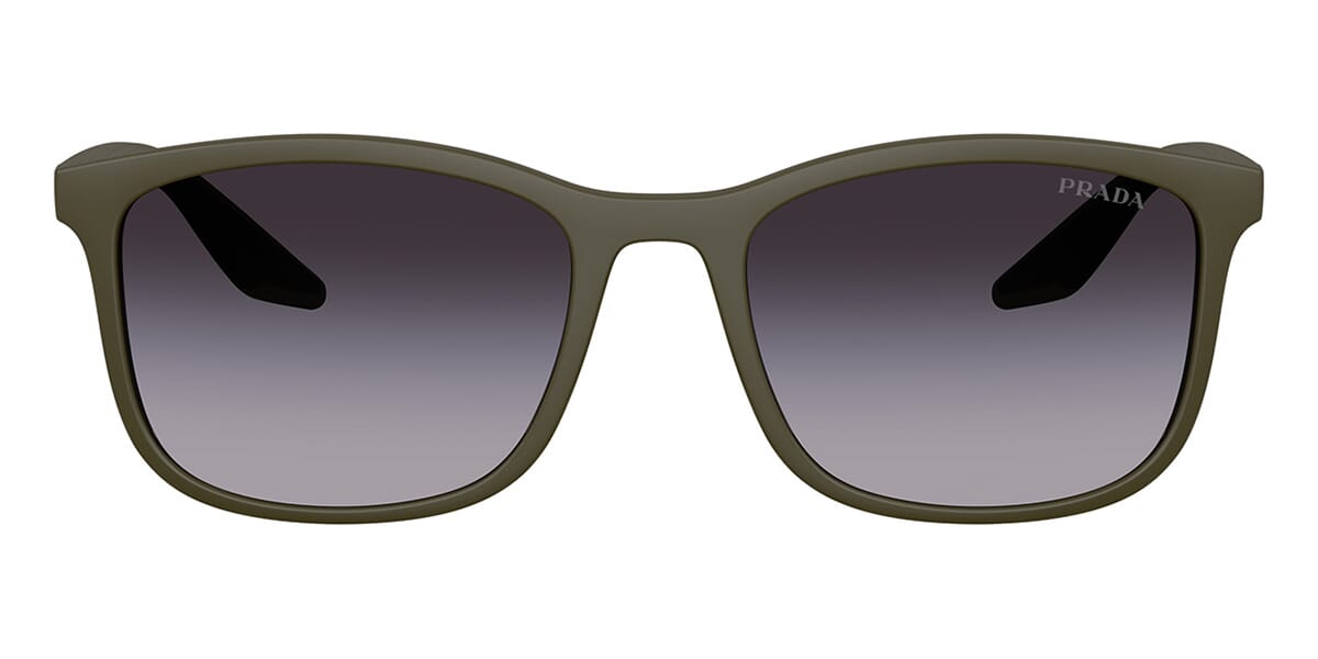 This square Prada Linea Rossa sunglass comes in a matte green frame with grey gradient lenses.