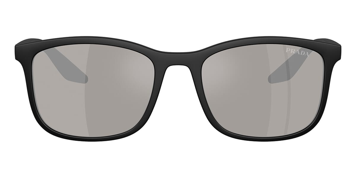 This square Prada Linea Rossa sunglass comes in a matte black frame with light grey with silver mirror lenses.