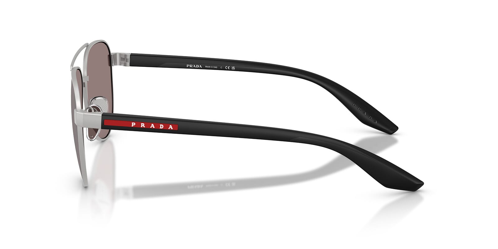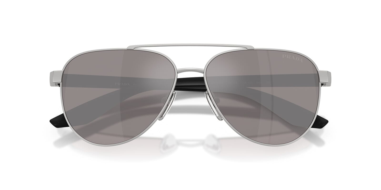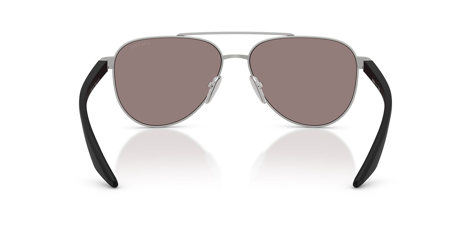 This aviator Prada Linea Rossa sunglass comes in a matte grey frame with purple brown with silver mirror lenses.