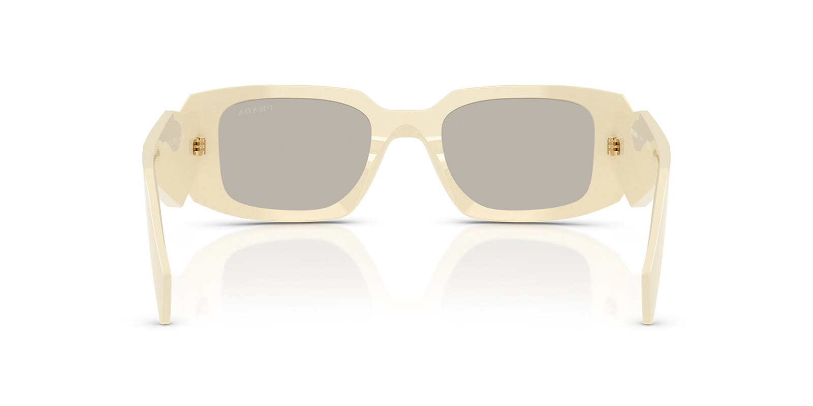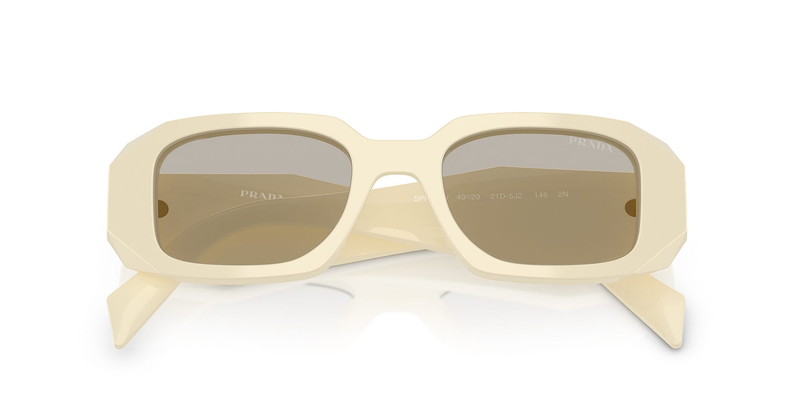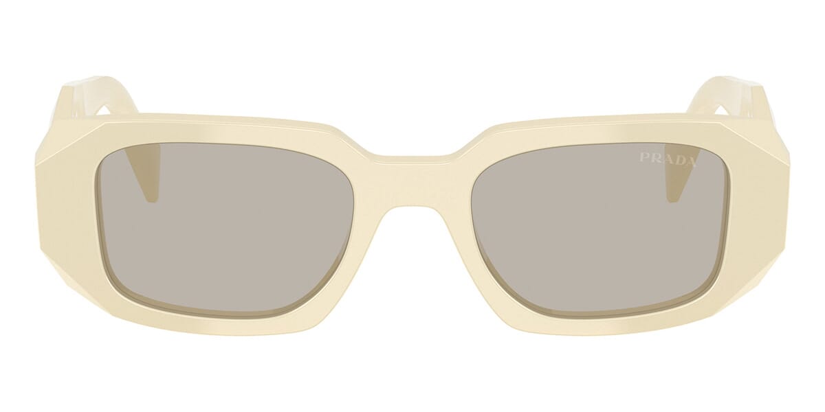 This rectangular Prada sunglass comes in a white milk frame with light brown lenses.