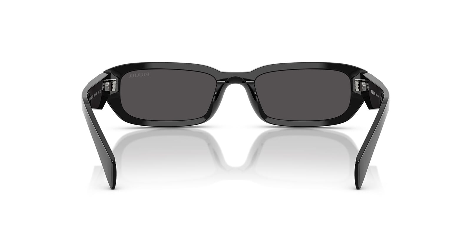 This rectangular Prada sunglass comes in a black frame with dark grey lenses.