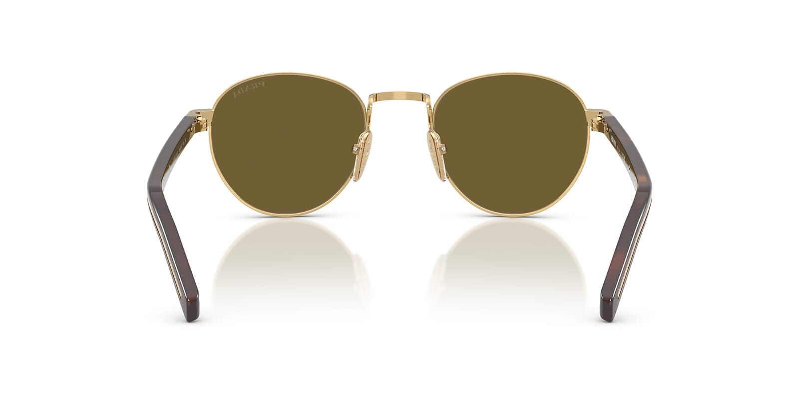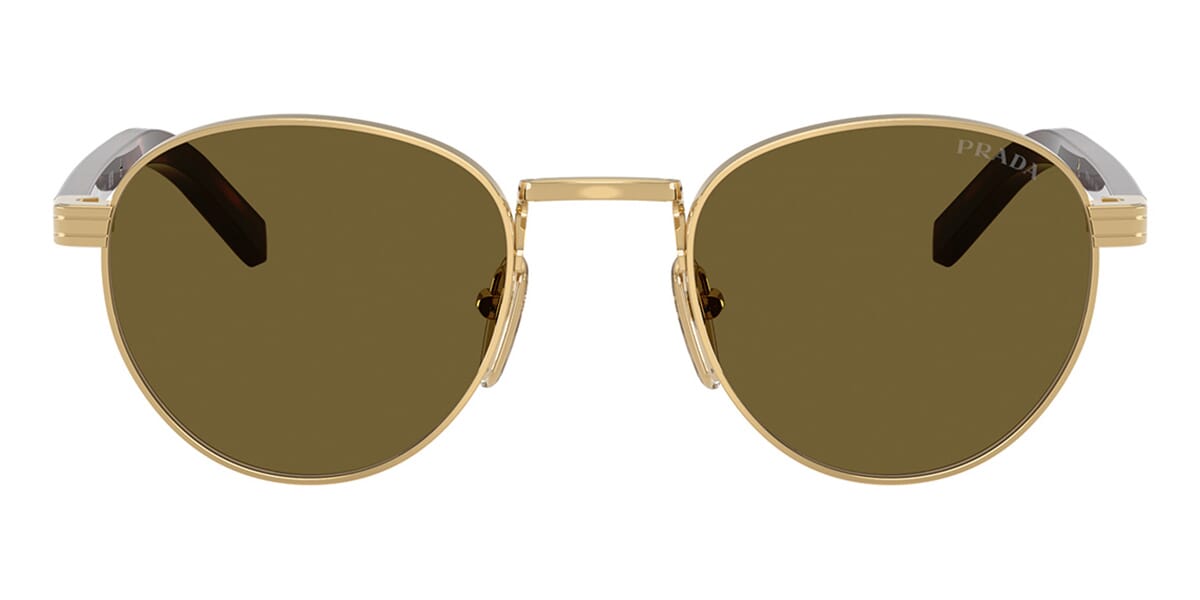 This round Prada sunglass comes in a gold frame with dark brown lenses.