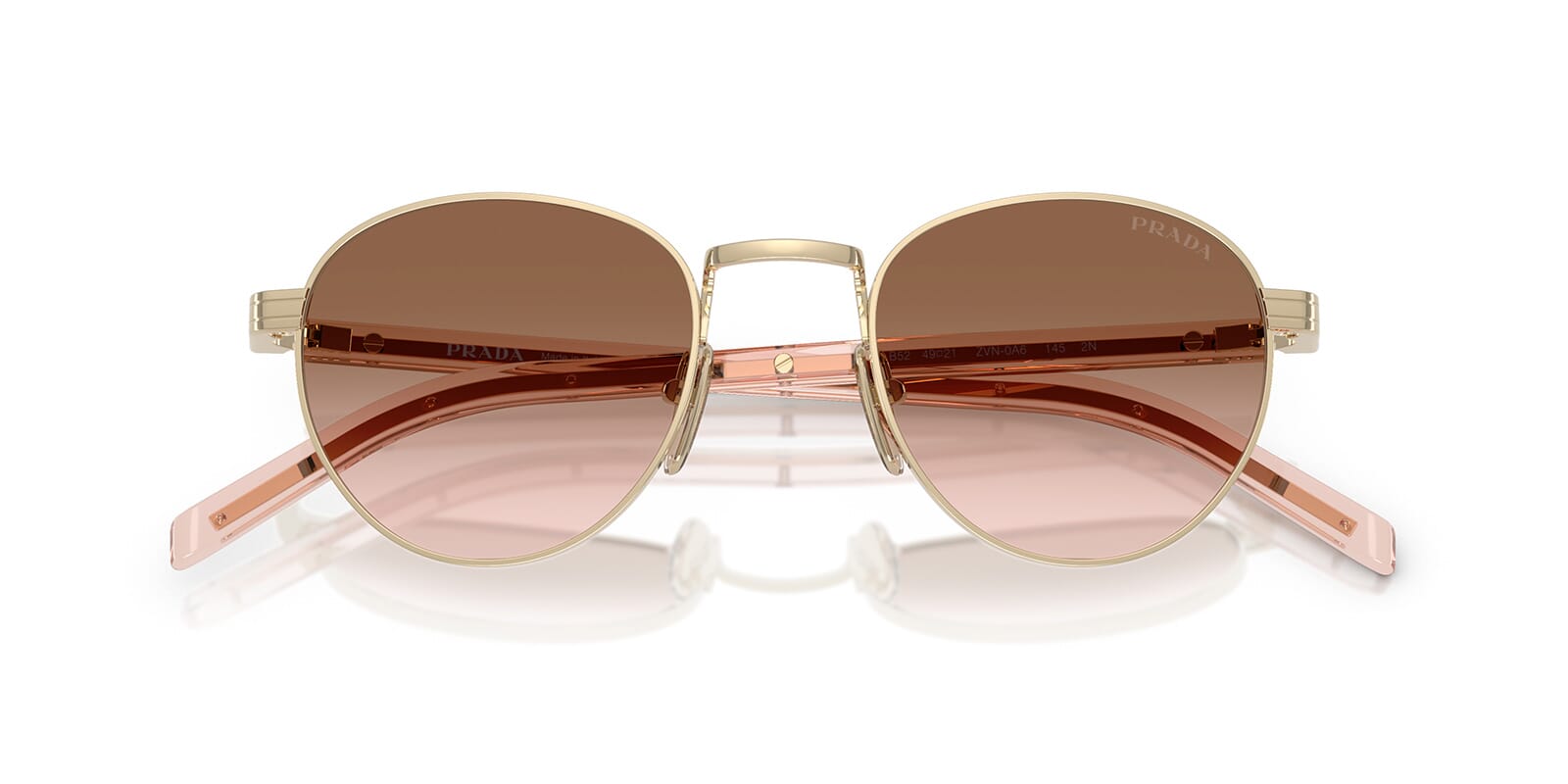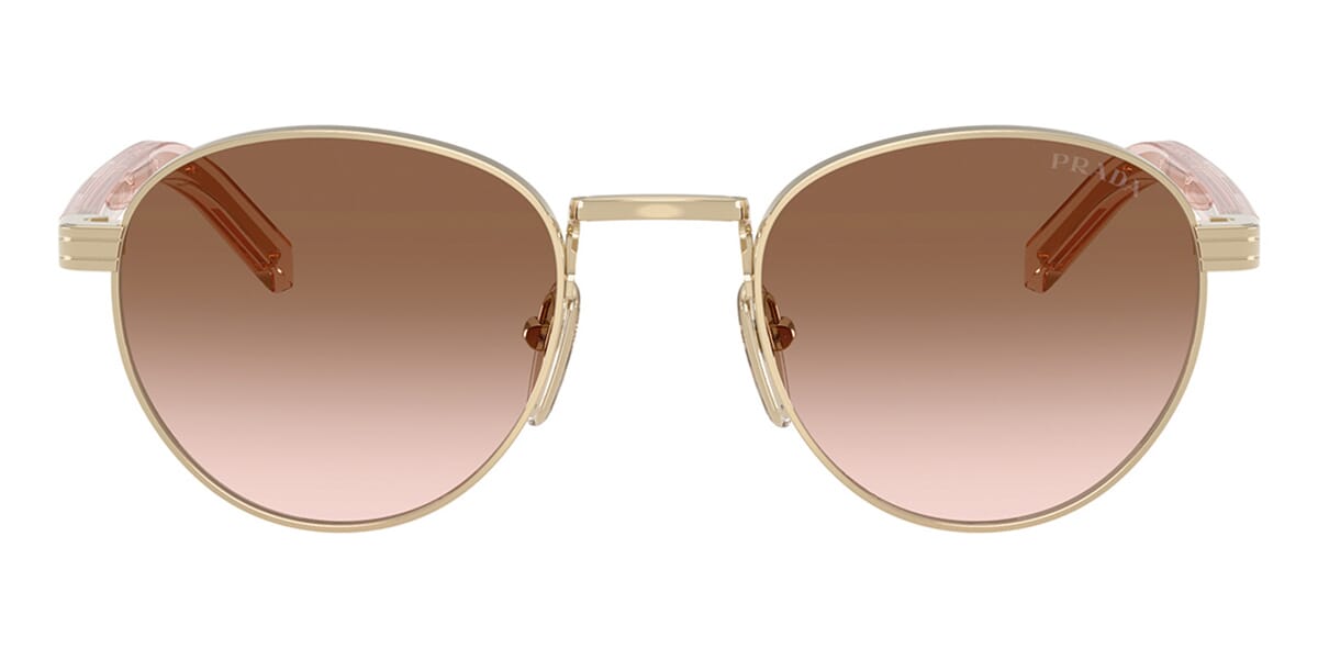 This round Prada sunglass comes in a pale gold frame with brown gradient lenses.