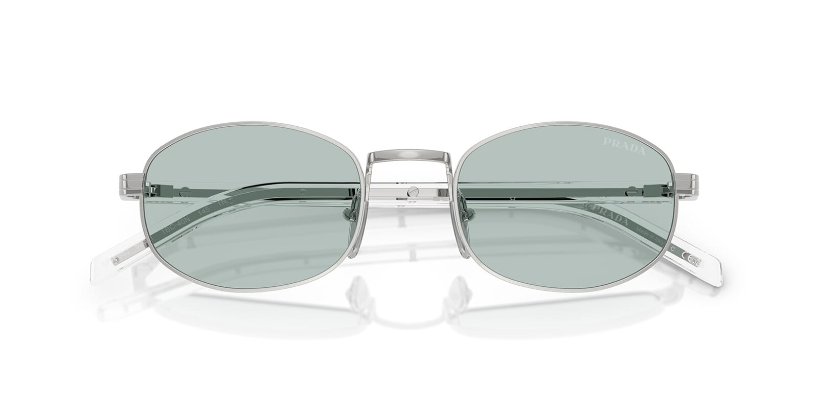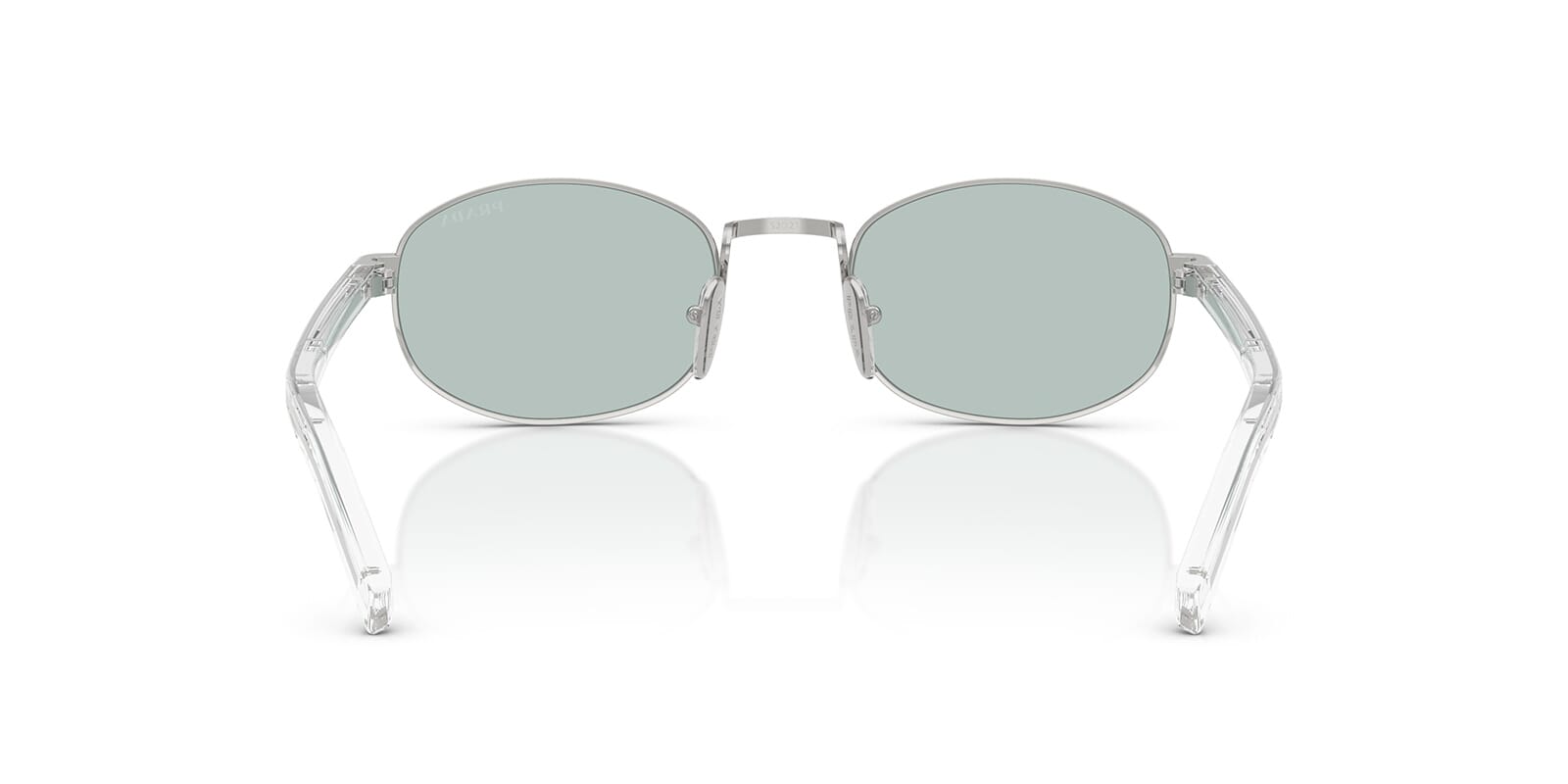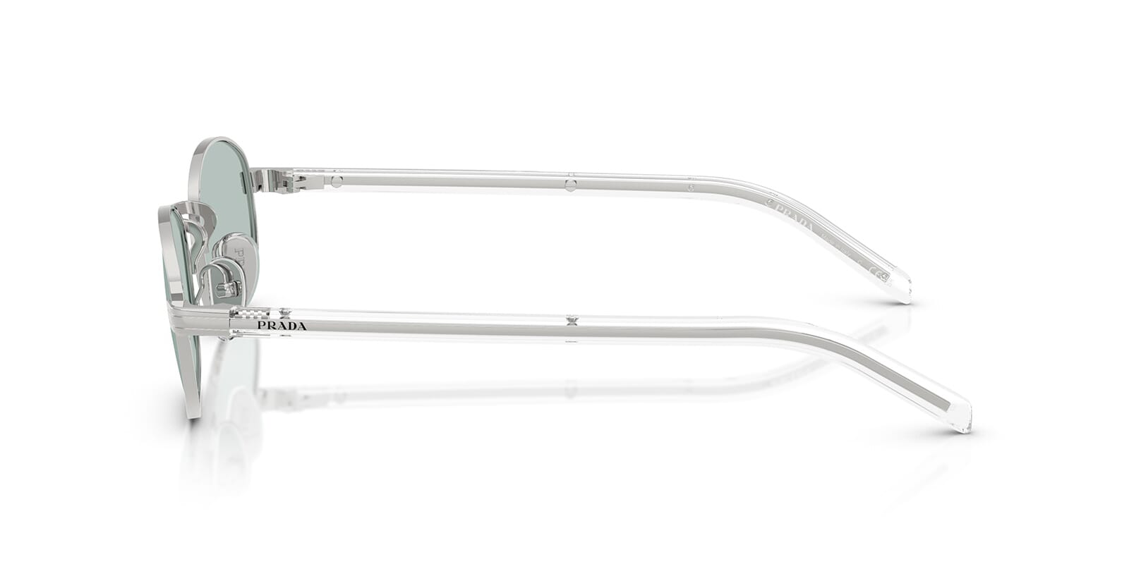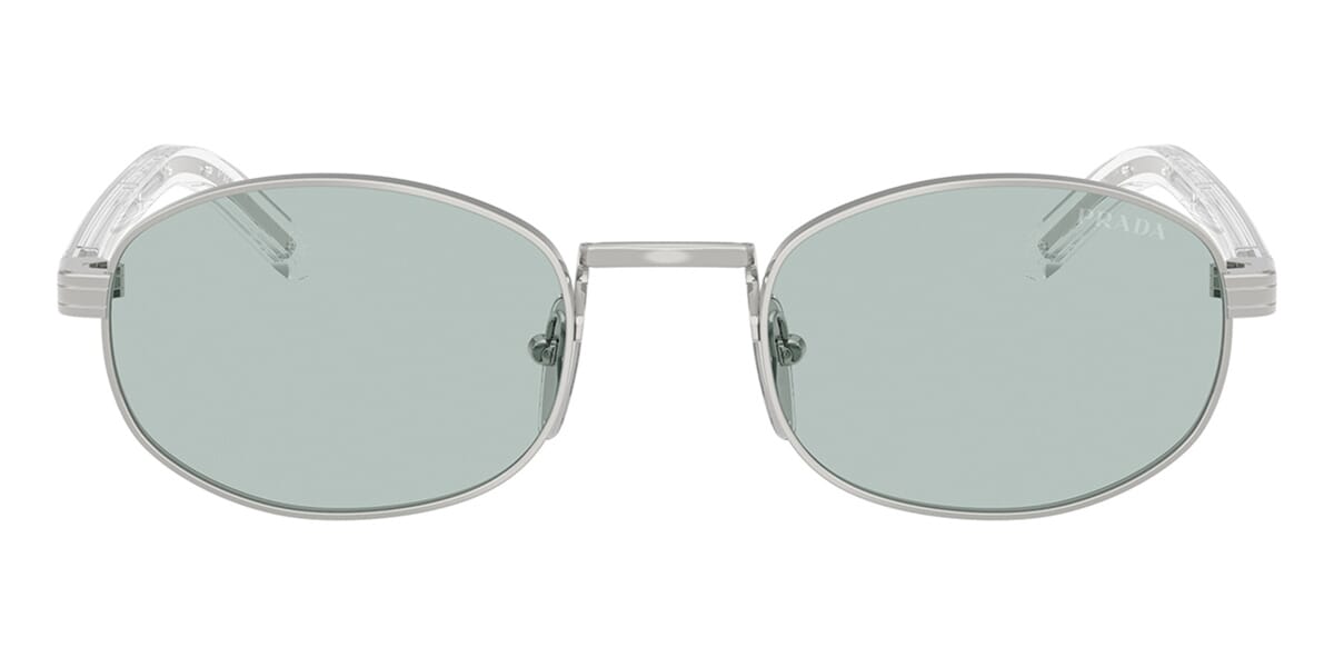 This round Prada sunglass comes in a silver frame with azure lenses.