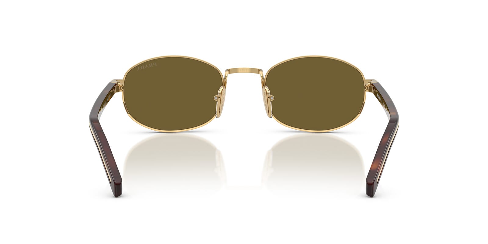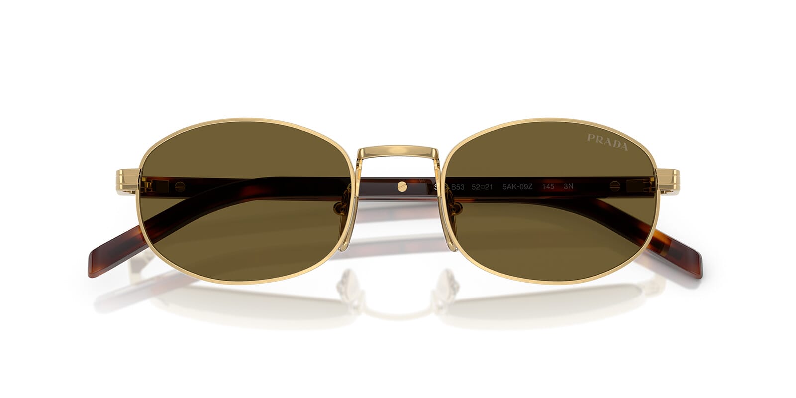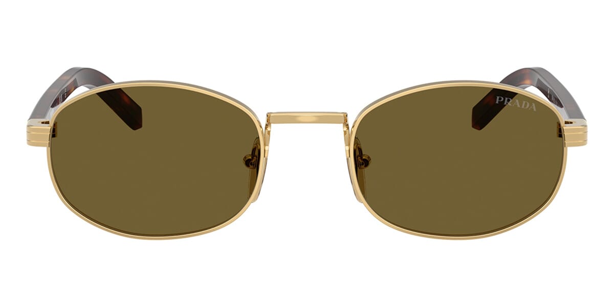 This round Prada sunglass comes in a gold frame with dark brown lenses.