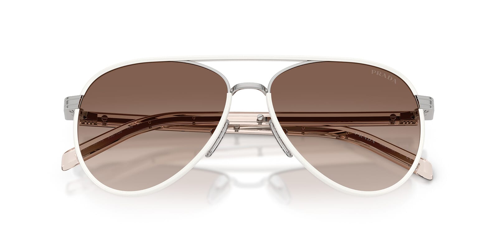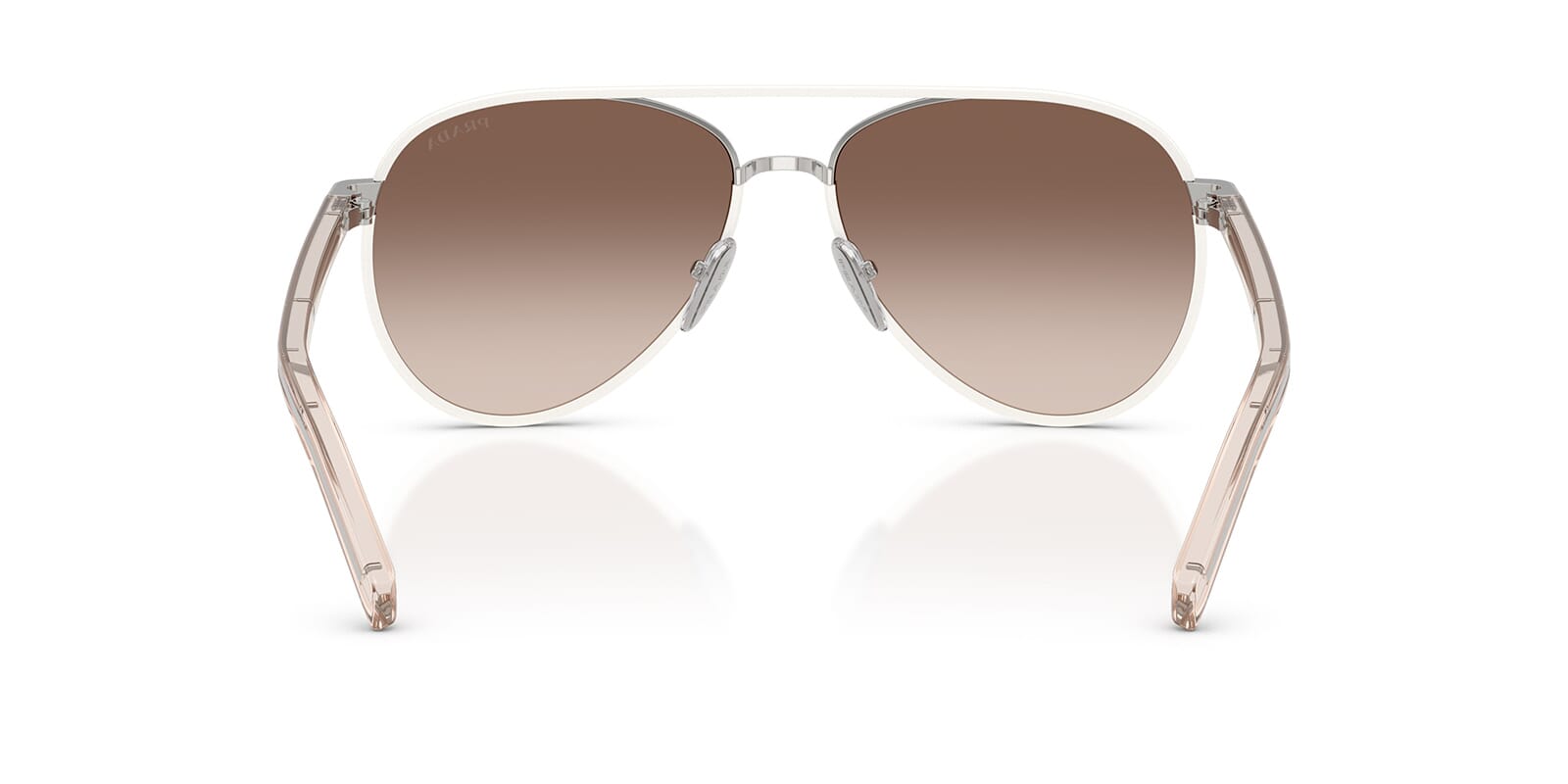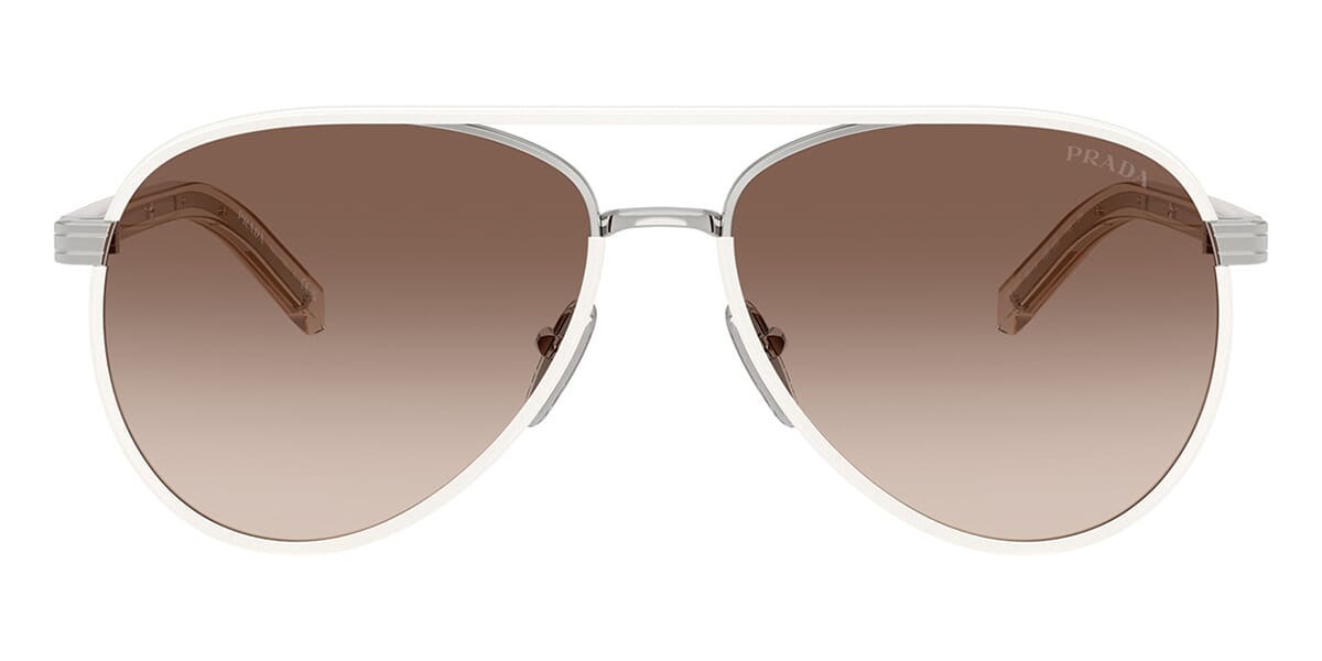 This aviator Prada sunglass comes in a silver frame with brown gradient lenses.