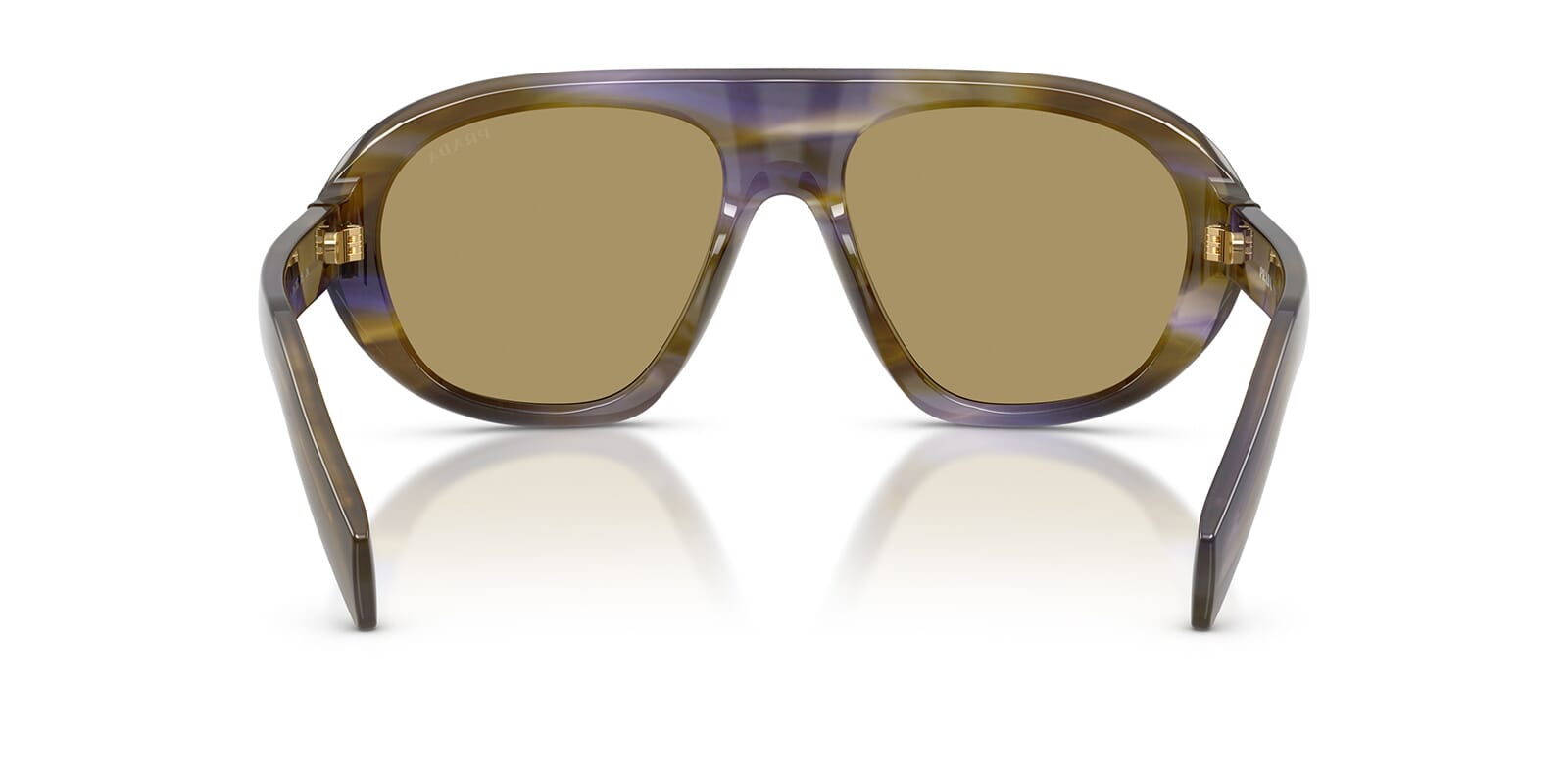 This aviator Prada sunglass comes in a striped laguna frame with green olive lenses.