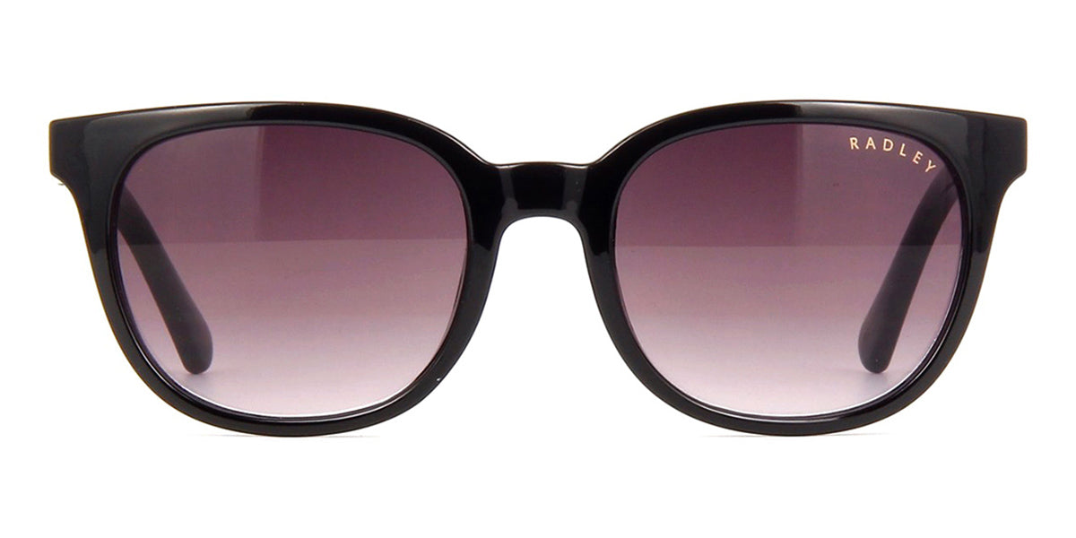 This round Radley sunglass comes in a shiny black frame with brown gradient lenses.