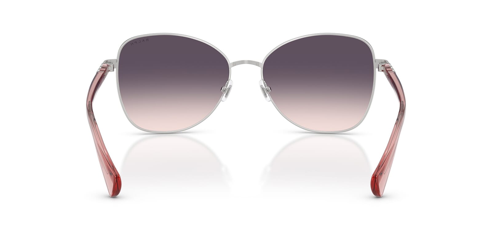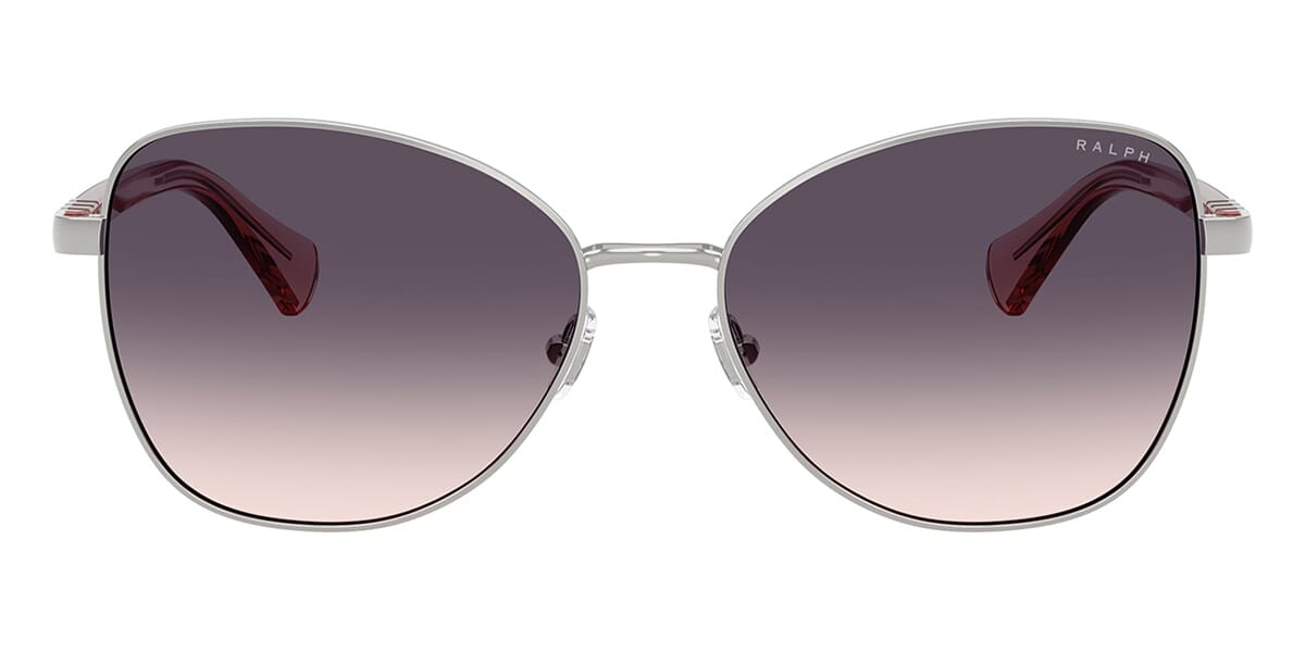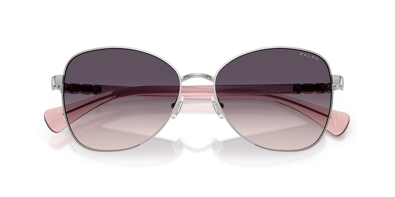 This butterfly Ralph by Ralph Lauren sunglass comes in a shiny silver frame with lillac pink gradient lenses.