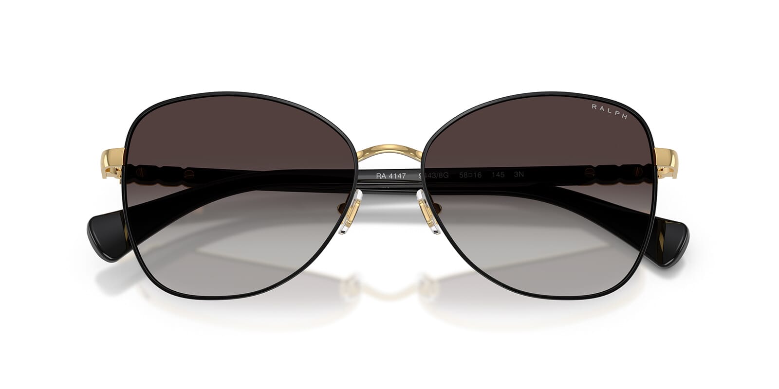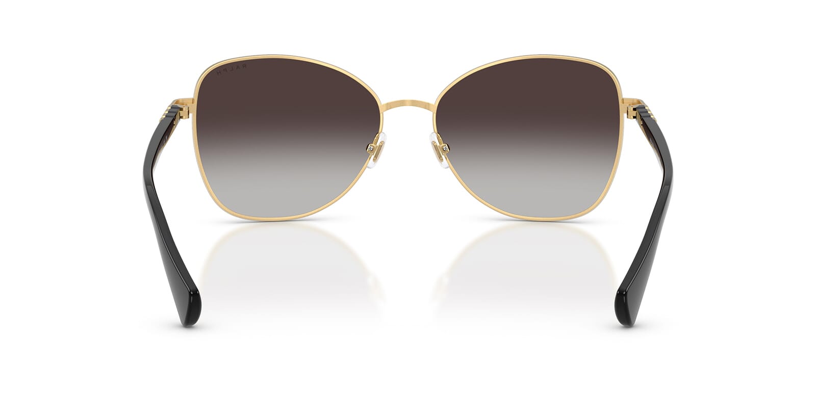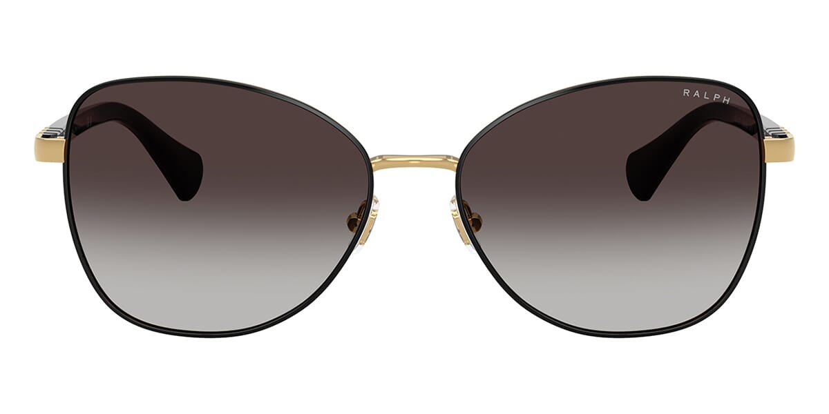 This butterfly Ralph by Ralph Lauren sunglass comes in a shiny black frame with grey gradient lenses.