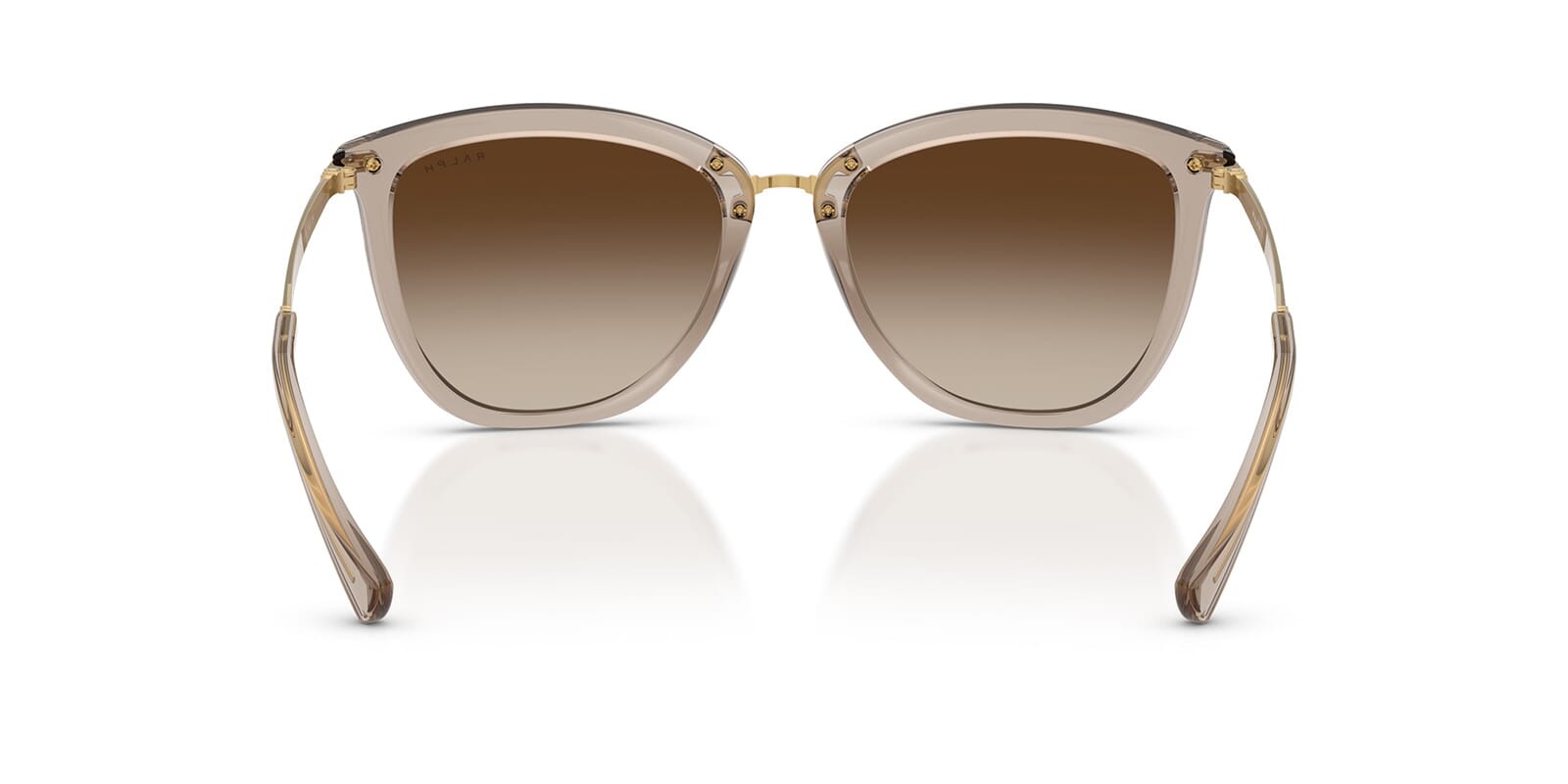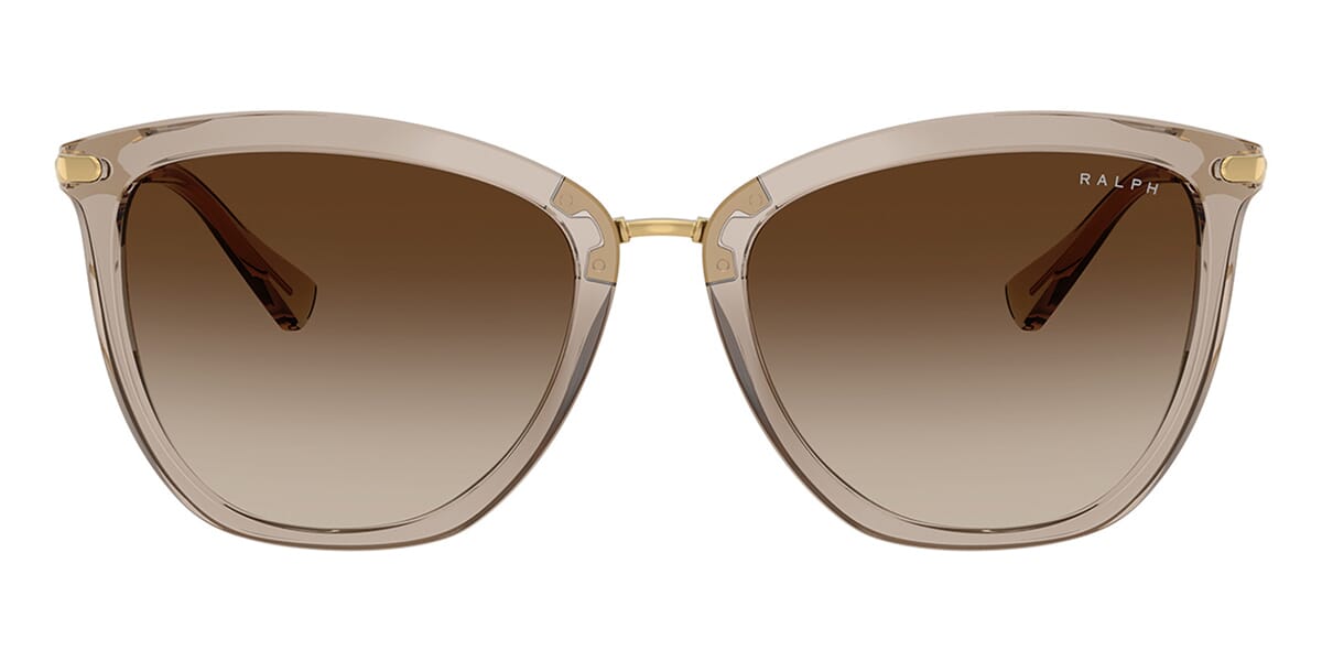 This cat eye Ralph by Ralph Lauren sunglass comes in a shiny beige frame with brown gradient lenses.