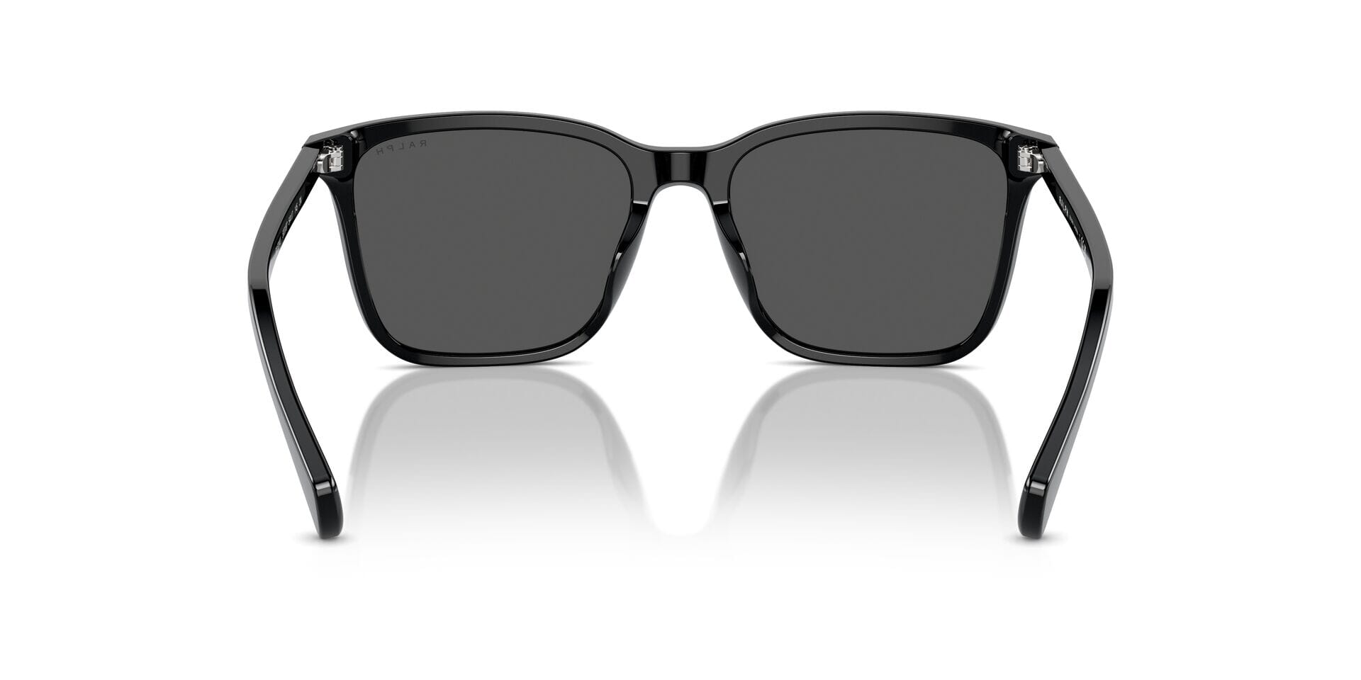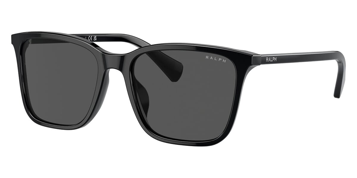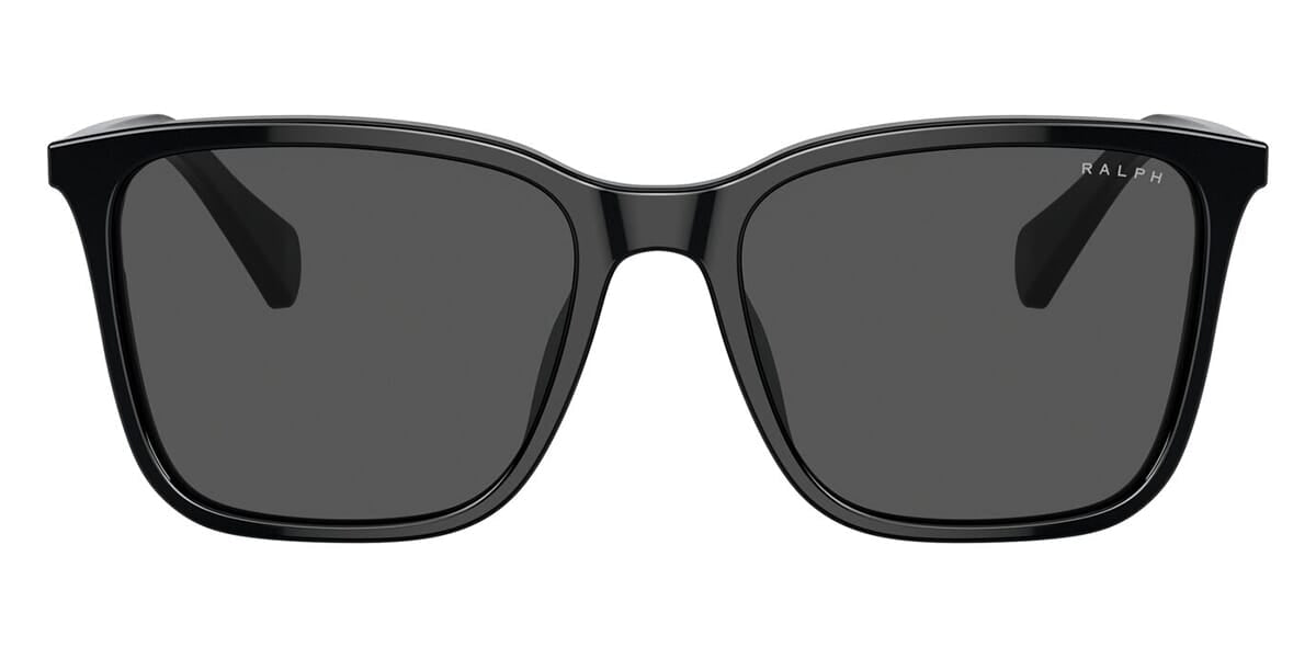 This square Ralph by Ralph Lauren sunglass comes in a shiny black frame with dark grey lenses.