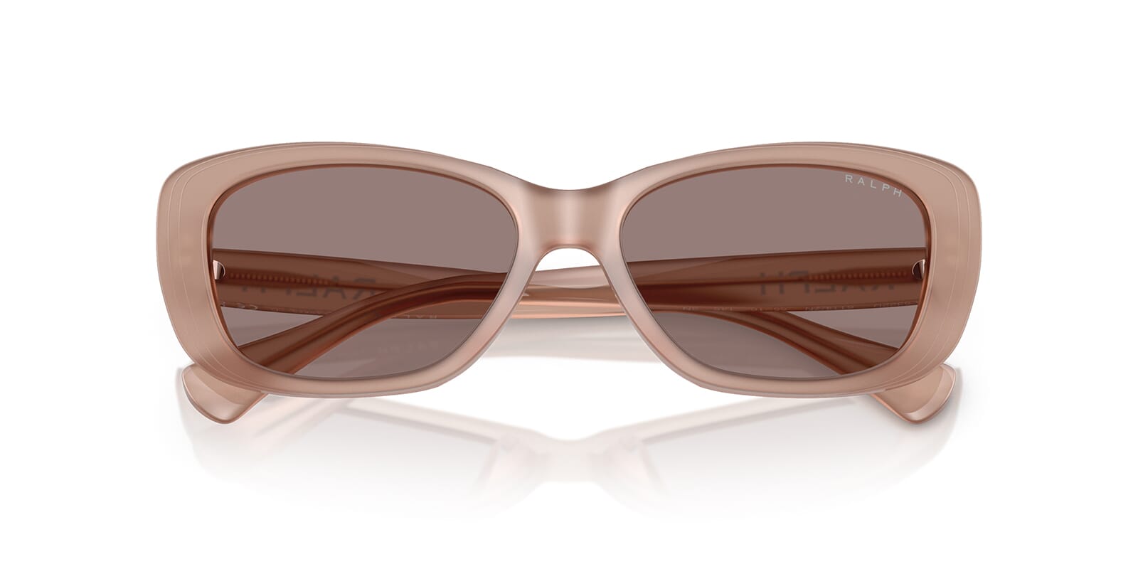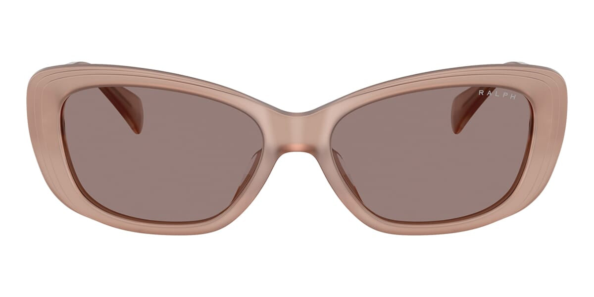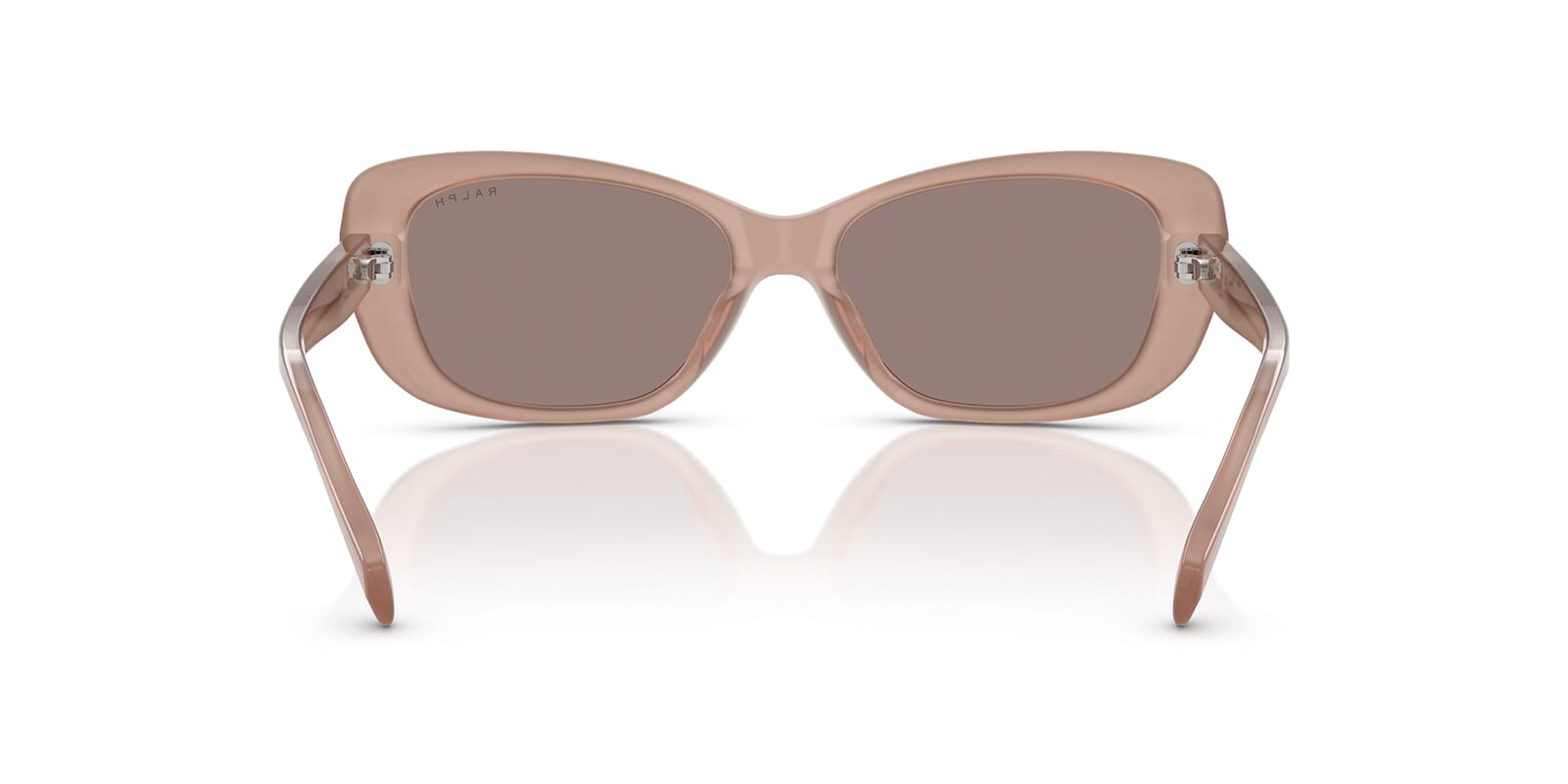 This rectangular Ralph by Ralph Lauren sunglass comes in a shiny opalescent rose frame with purple to brown mirror lenses.