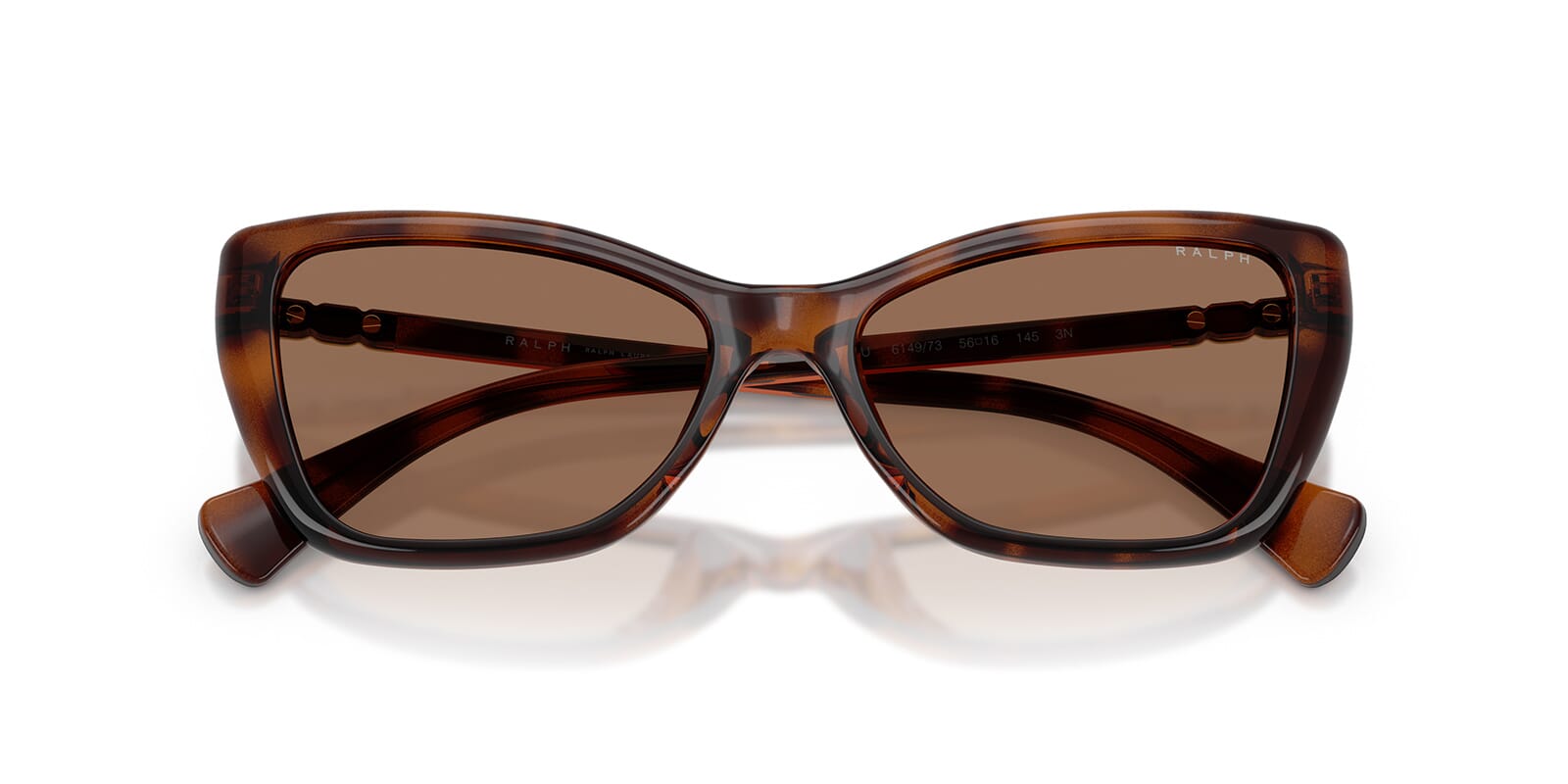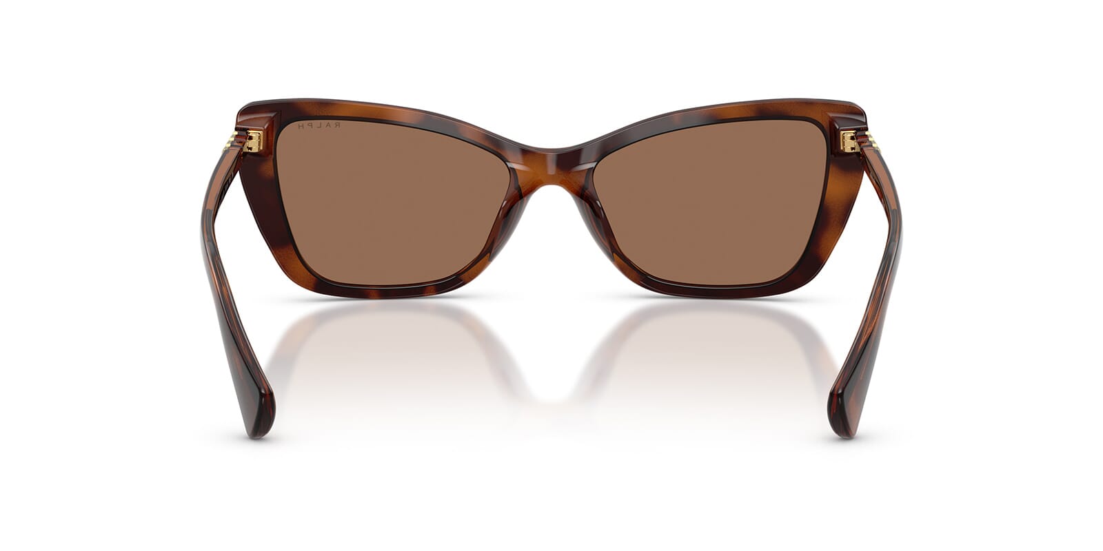 This cat eye Ralph by Ralph Lauren sunglass comes in a shiny dark havana frame with brown lenses.