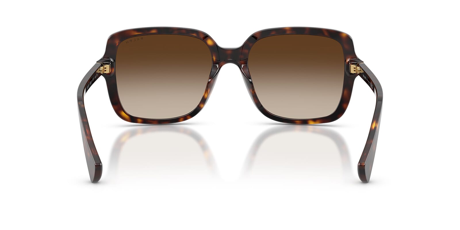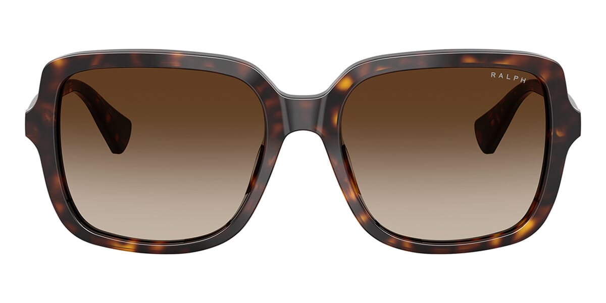 This square Ralph by Ralph Lauren sunglass comes in a shiny dark havana frame with brown gradient lenses.