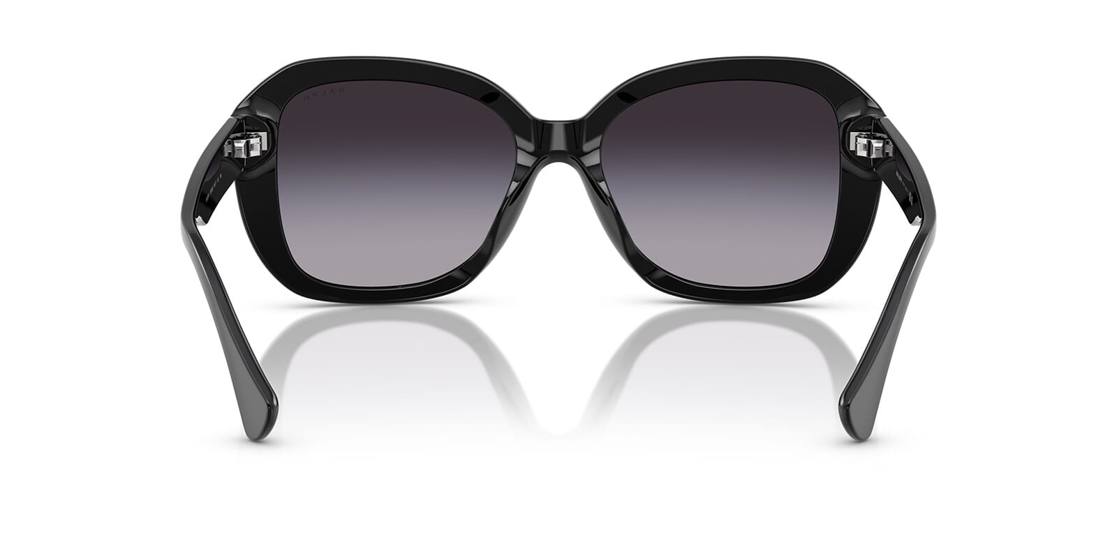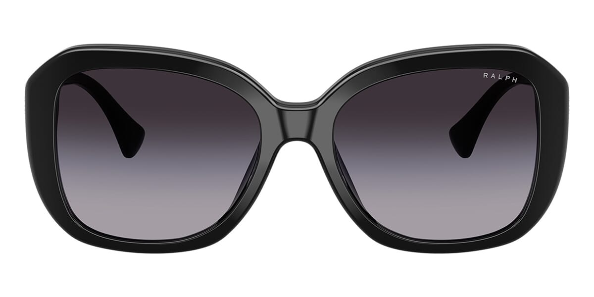 This square Ralph by Ralph Lauren sunglass comes in a shiny black frame with grey gradient lenses.