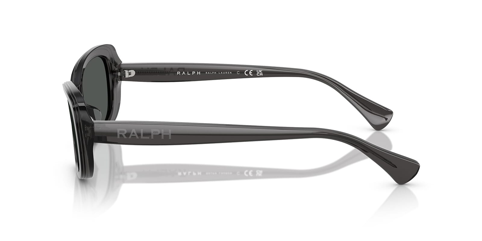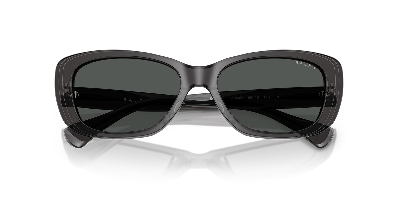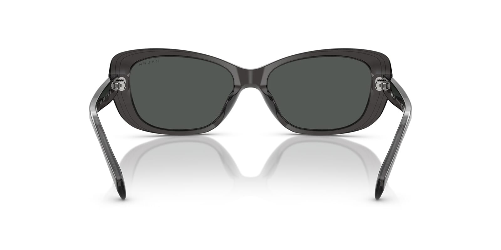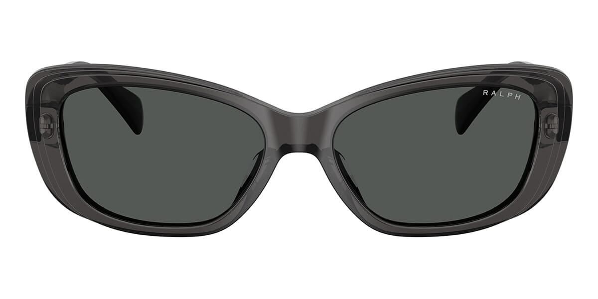 This rectangular Ralph by Ralph Lauren sunglass comes in a shiny transparent black frame with grey lenses.