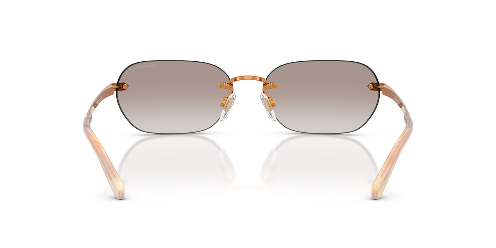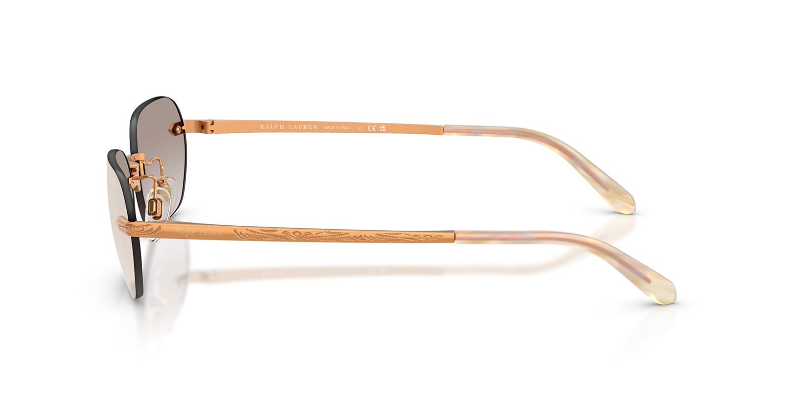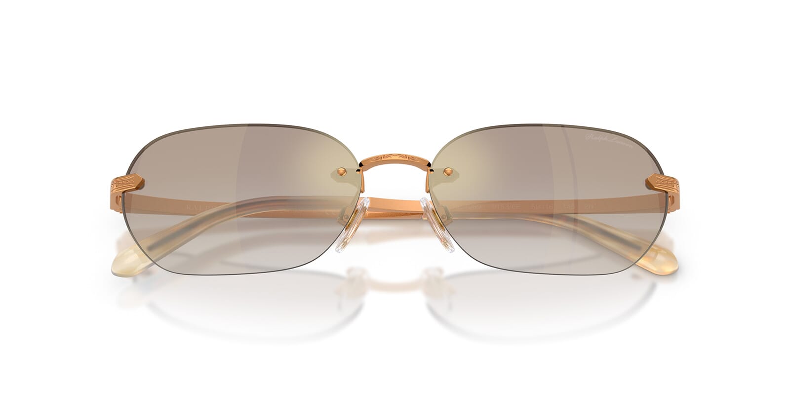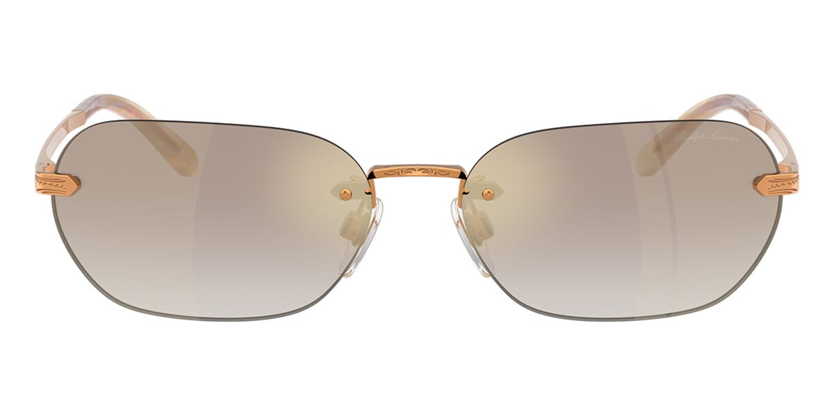 This rectangular Ralph Lauren sunglass comes in a shiny antique gold frame with brown with gold gradient mirror lenses.