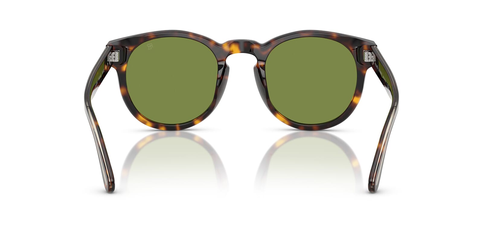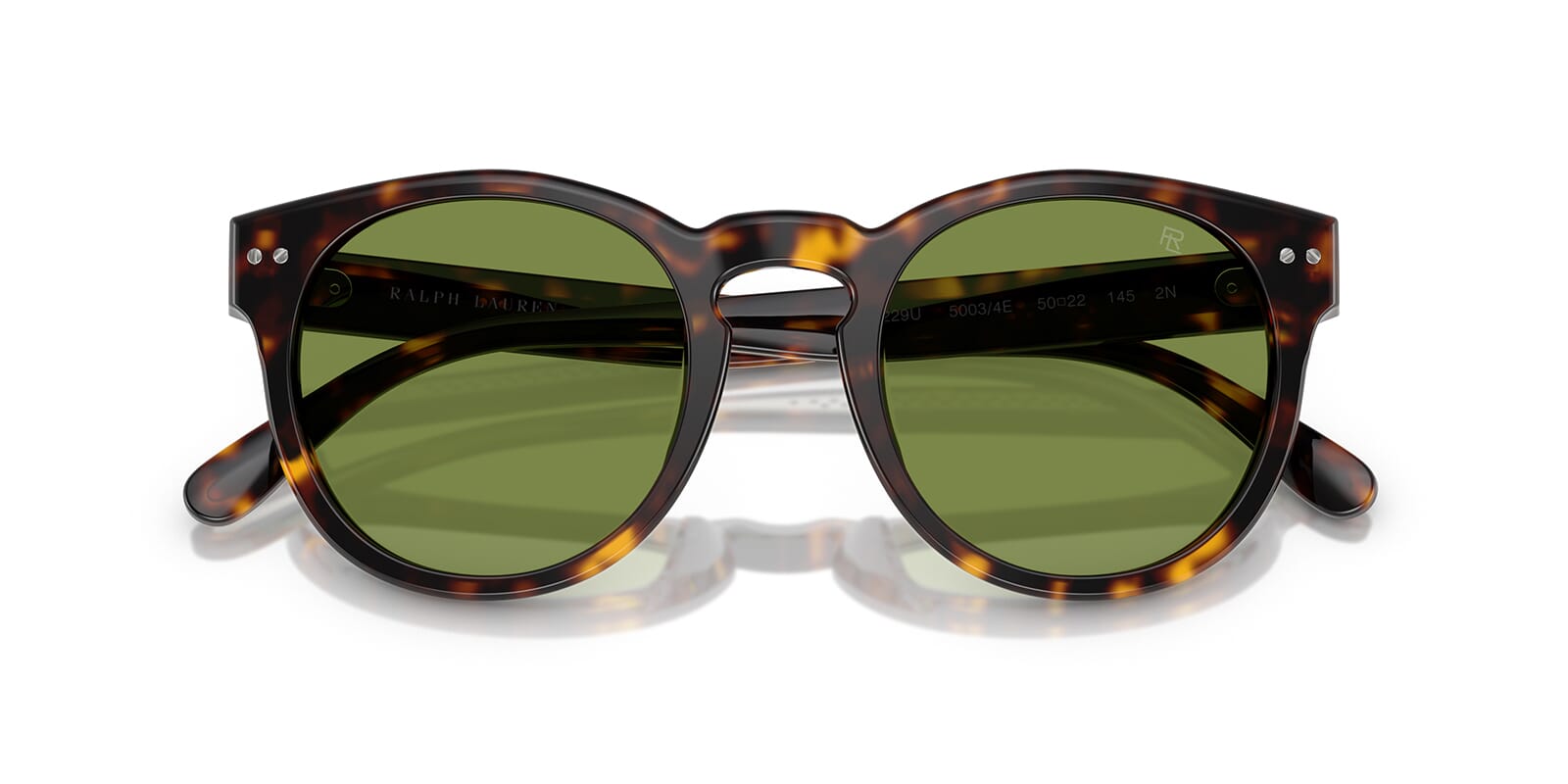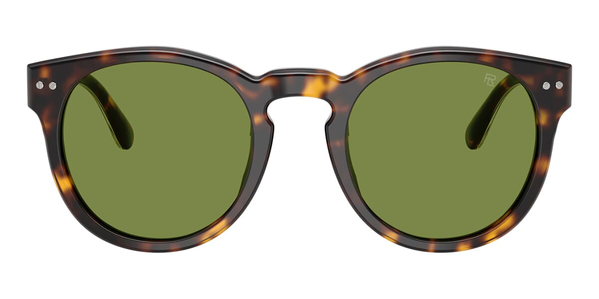 This round Ralph Lauren sunglass comes in a dark havana frame with solid green lenses.