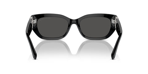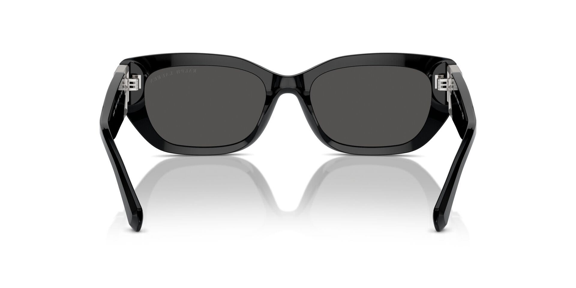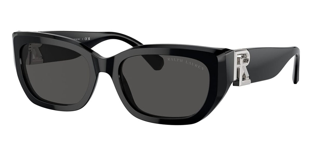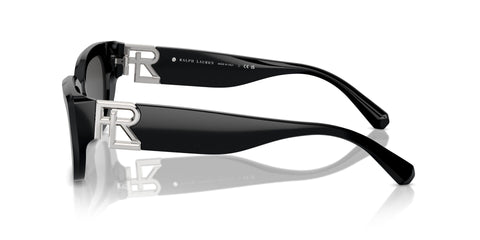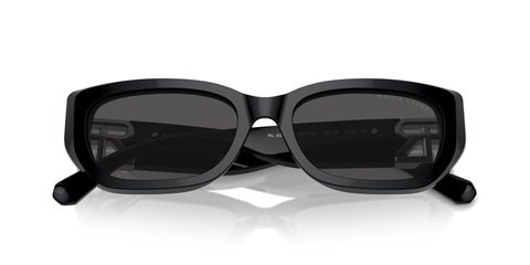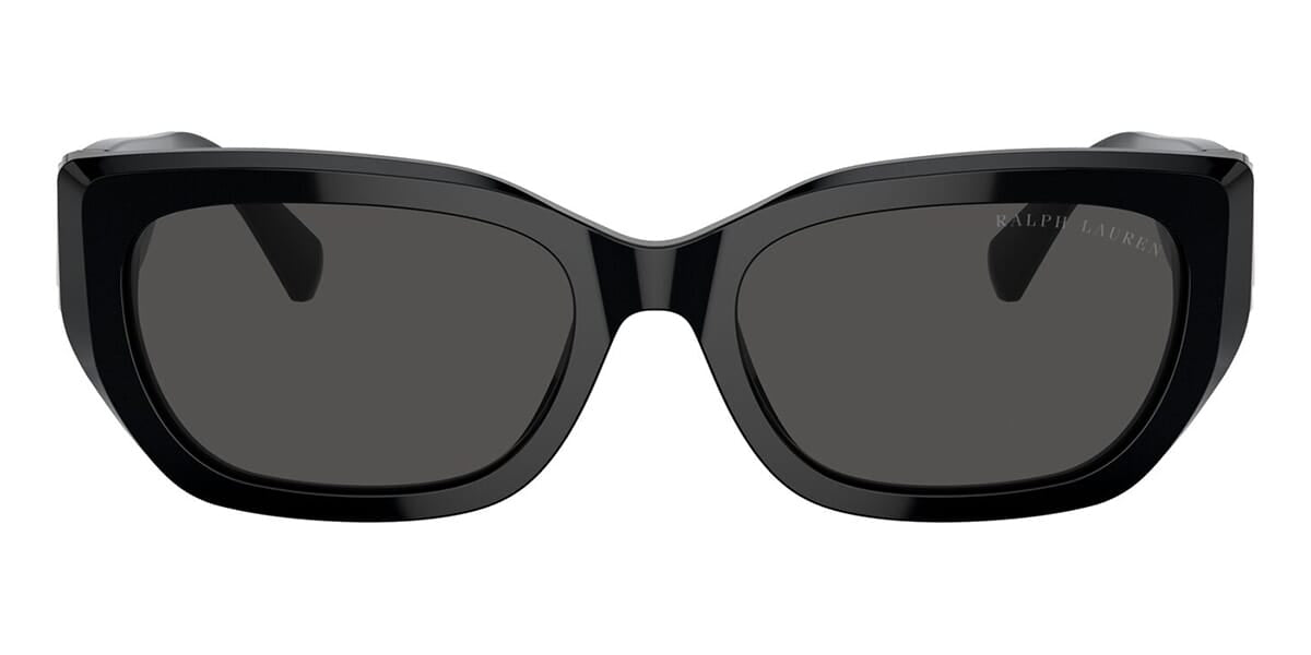 This cat eye Ralph Lauren sunglass comes in a shiny black frame with dark grey lenses.