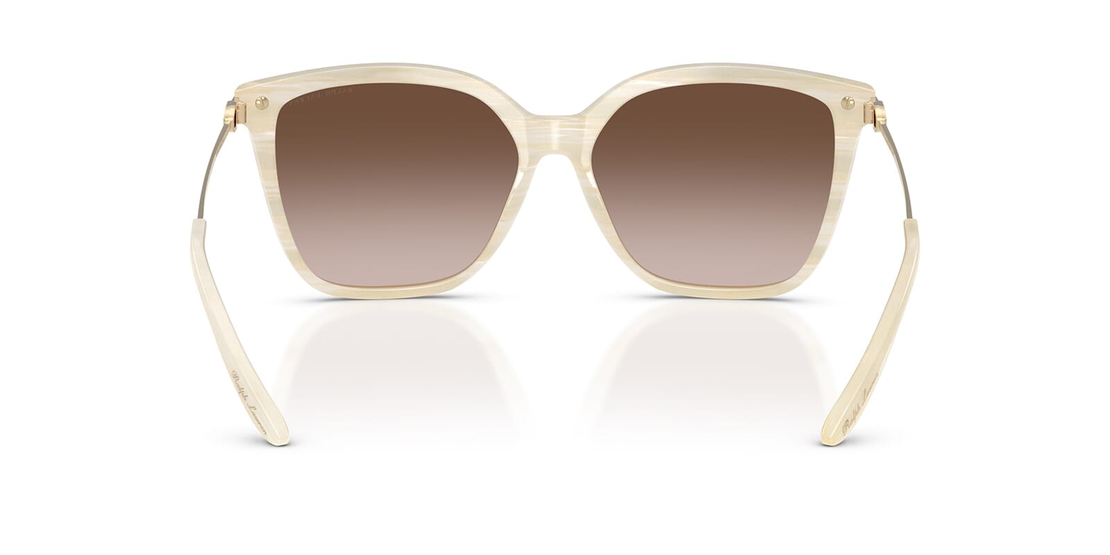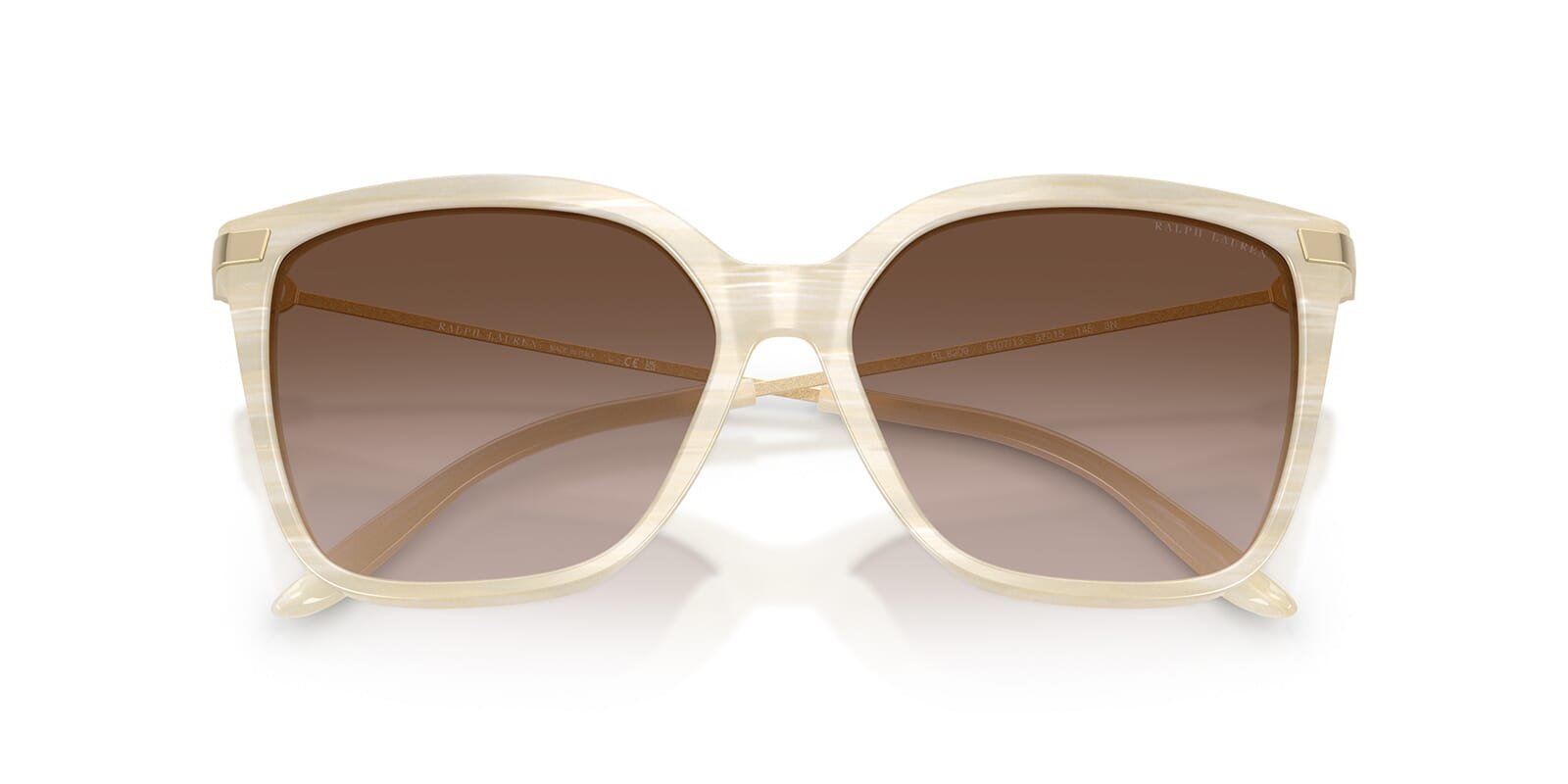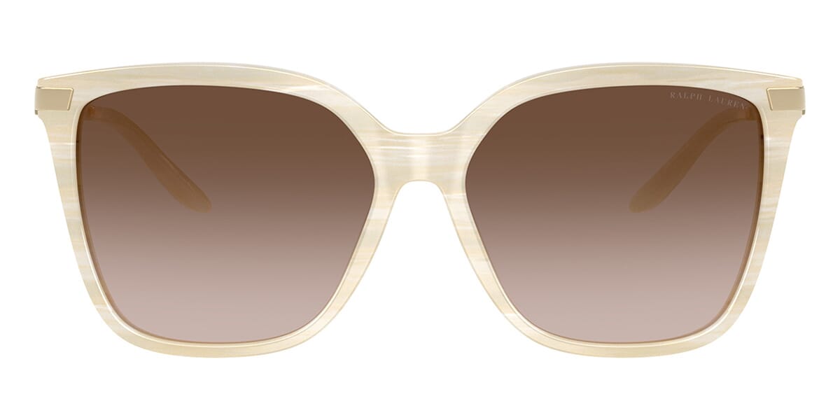 This butterfly Ralph Lauren sunglass comes in a cream horn frame with brown gradient lenses.