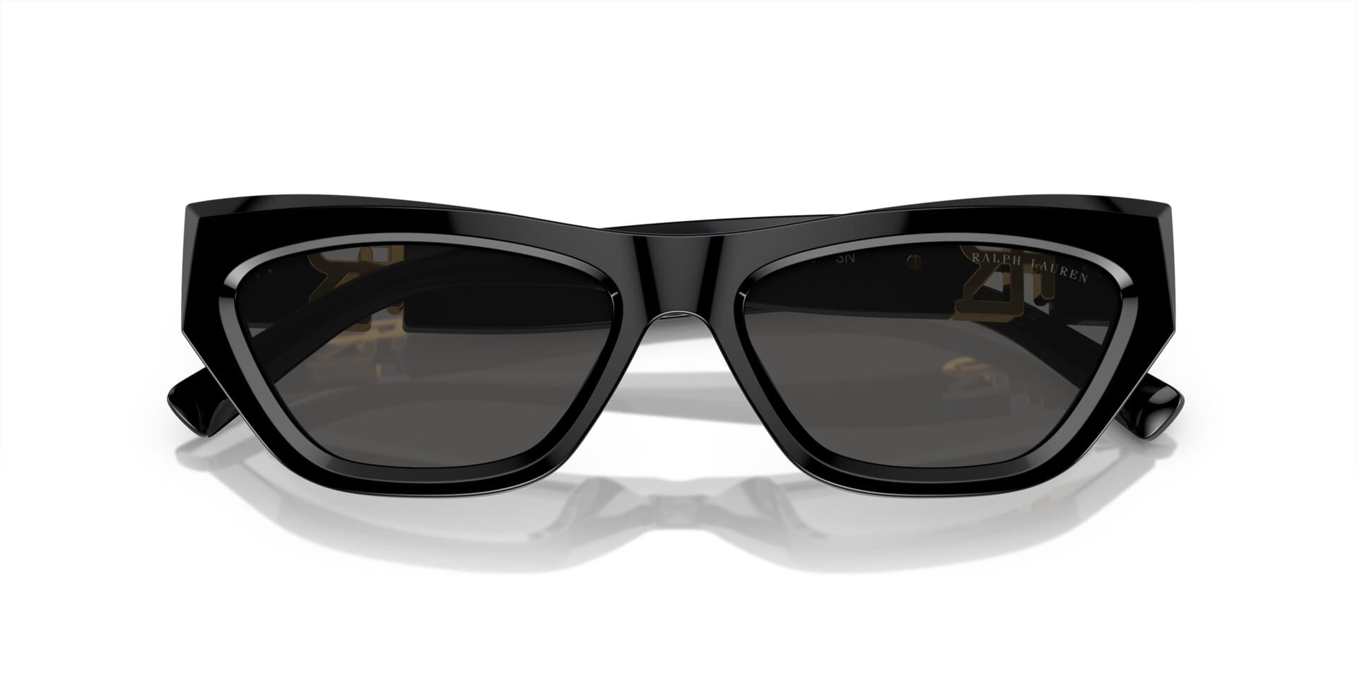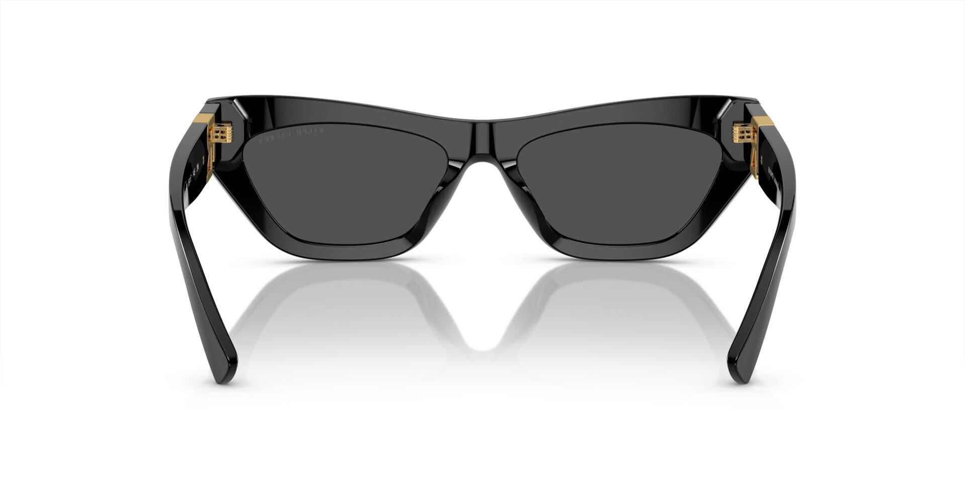 This cat eye Ralph Lauren sunglass comes in a black frame with grey lenses.
