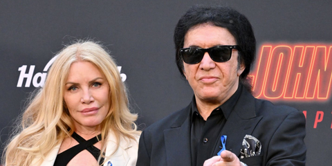 Gene Simmons, pictured with wife Shannon Tweed, was seen wearing black Ray-Ban New Wayfarer 2132 901/58 Polarised sunglasses at the Los Angeles Premiere of Lionsgate's "John Wick: Chapter 4" in March 2023