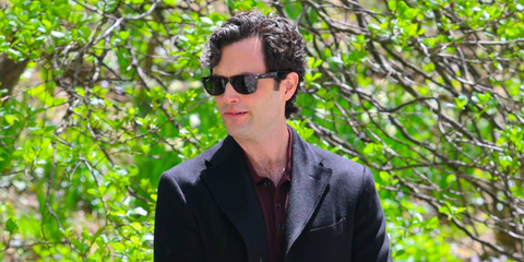 Penn Badgley was seen wearing black Ray-Ban New Wayfarer 2132 901/58 Polarised sunglasses on the set of Netflix series You, in New York City, April 2024