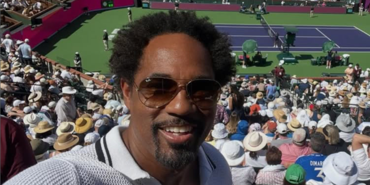 Actor Jason Winston George was seen wearing Ray-Ban Aviator 3025 001/51 Gold/Light Brown Gradient sunglasses at the BNP Paribas Open at Indian Wells Tennis Garden, March 2026.