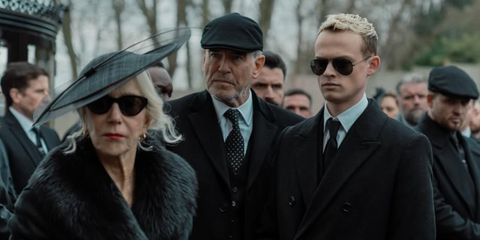 Anson Boon, pictured with Helen Mirren and Pierce Brosnan, was seen wearing black Ray-Ban Aviator Large Metal II RB 3026 L2821 oversized sunglasses in 2025 Paramount+ series MobLand, as Eddie Harrigan