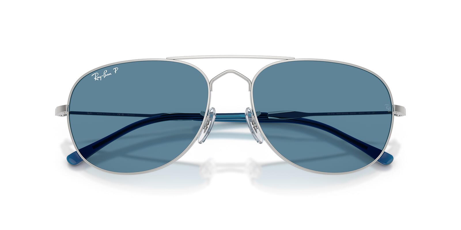 This round Ray-Ban sunglass comes in a silver frame with blue polarised lenses.