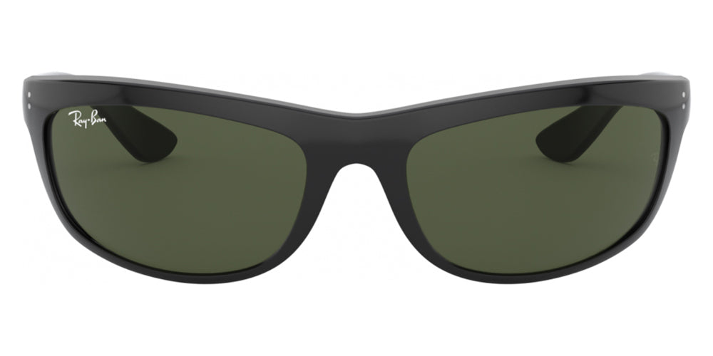This wraparound Ray-Ban sunglass comes in a shiny black frame with green with light mirror lenses.