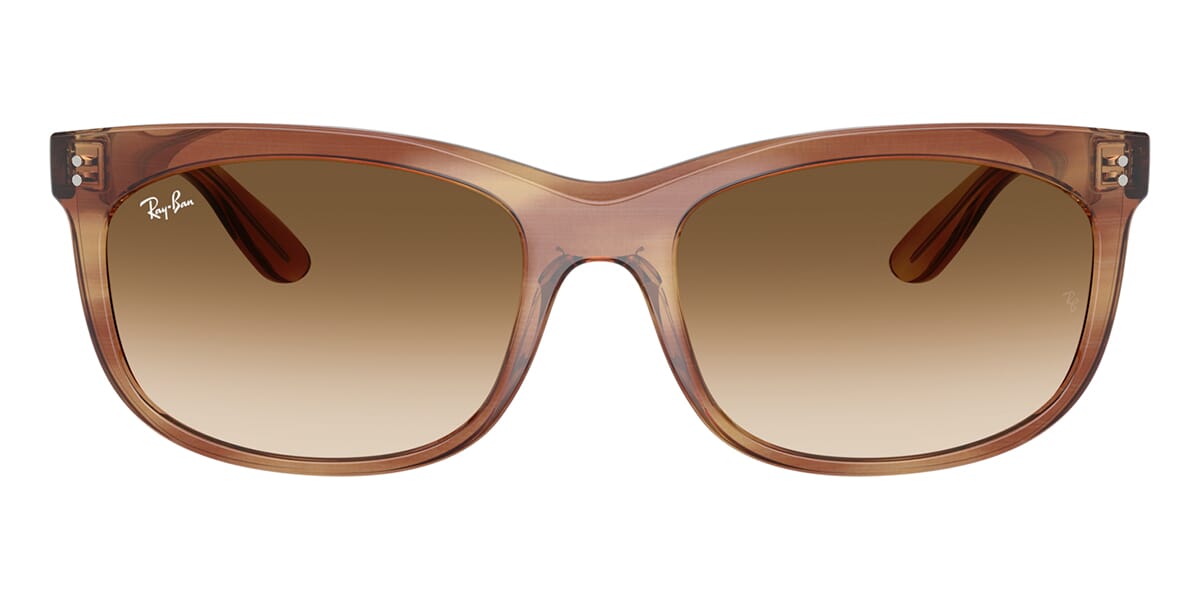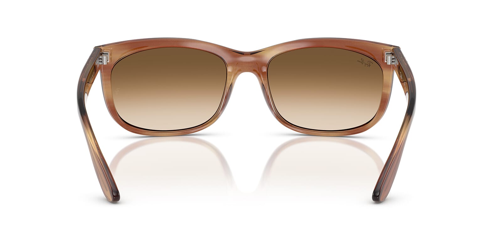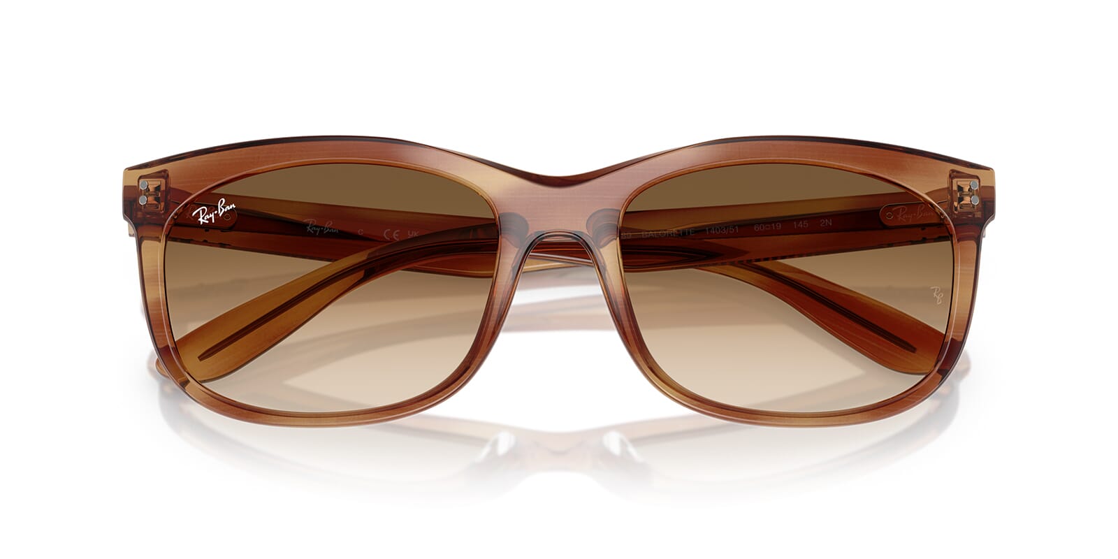 This rectangular Ray-Ban sunglass comes in a striped brown frame with brown to clear gradient lenses.