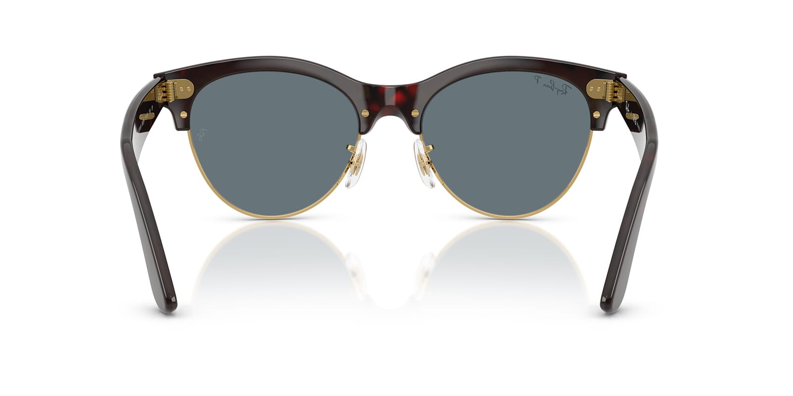 This round Ray-Ban sunglass comes in a red havana on gold frame with dark blue polarised lenses.