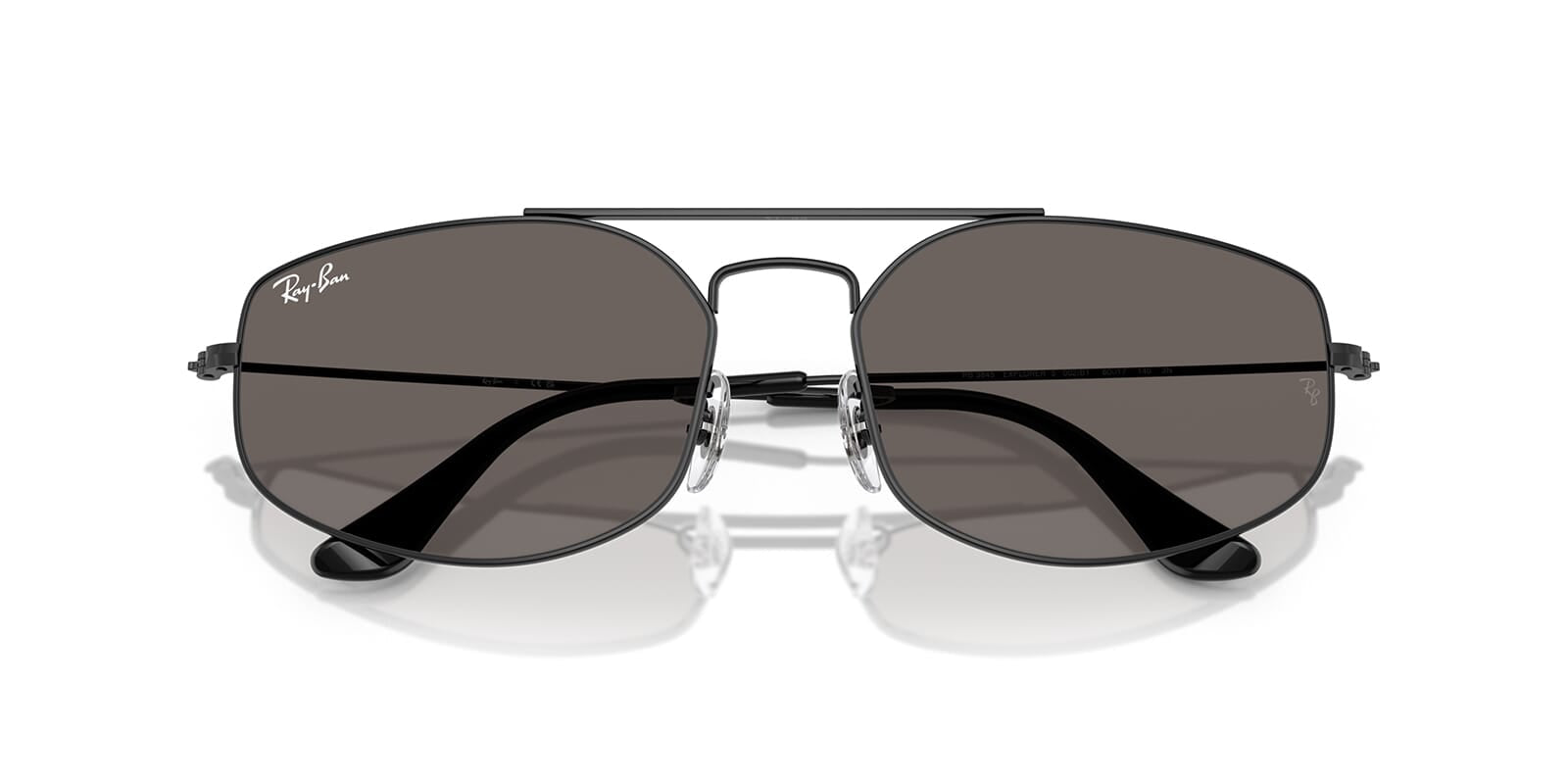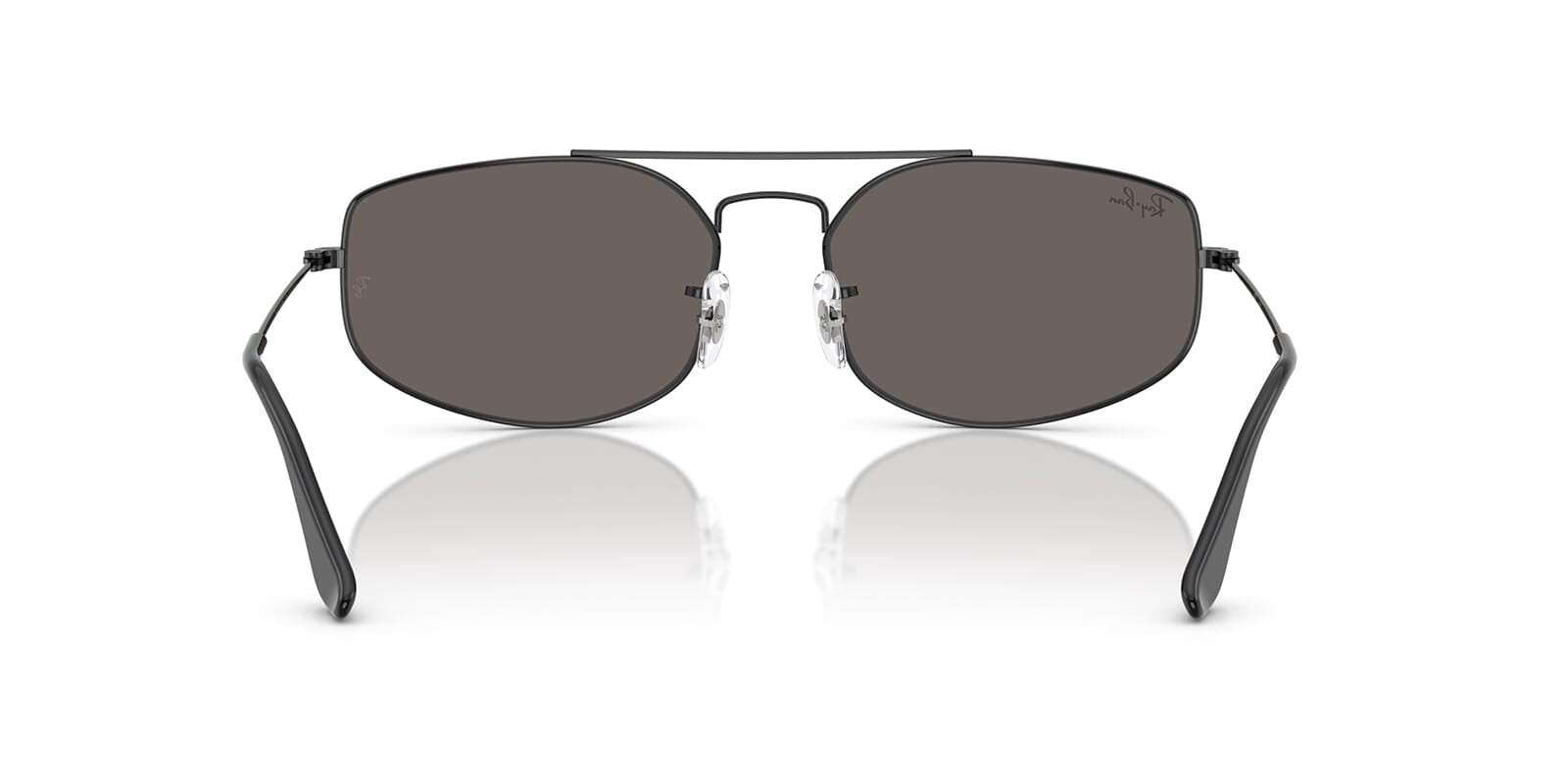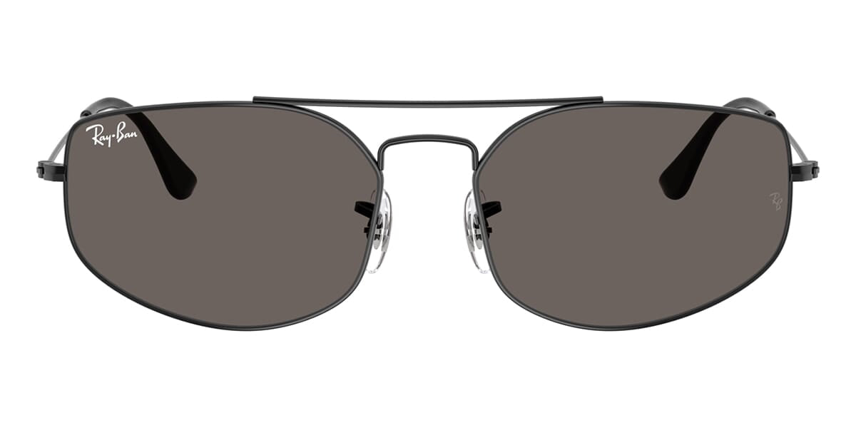 This rectangular Ray-Ban sunglass comes in a black frame with dark grey lenses.