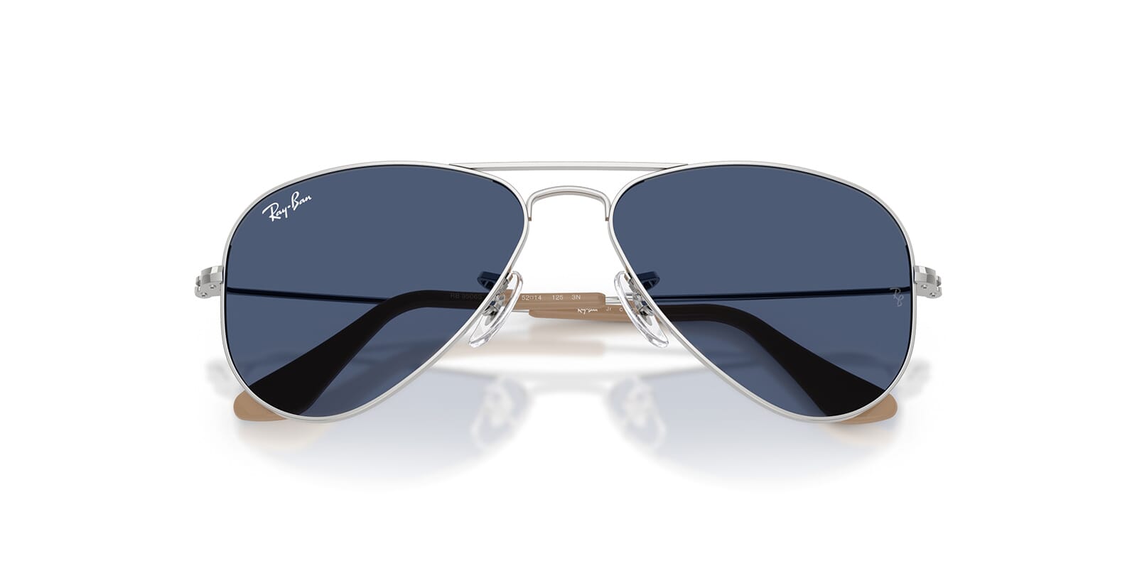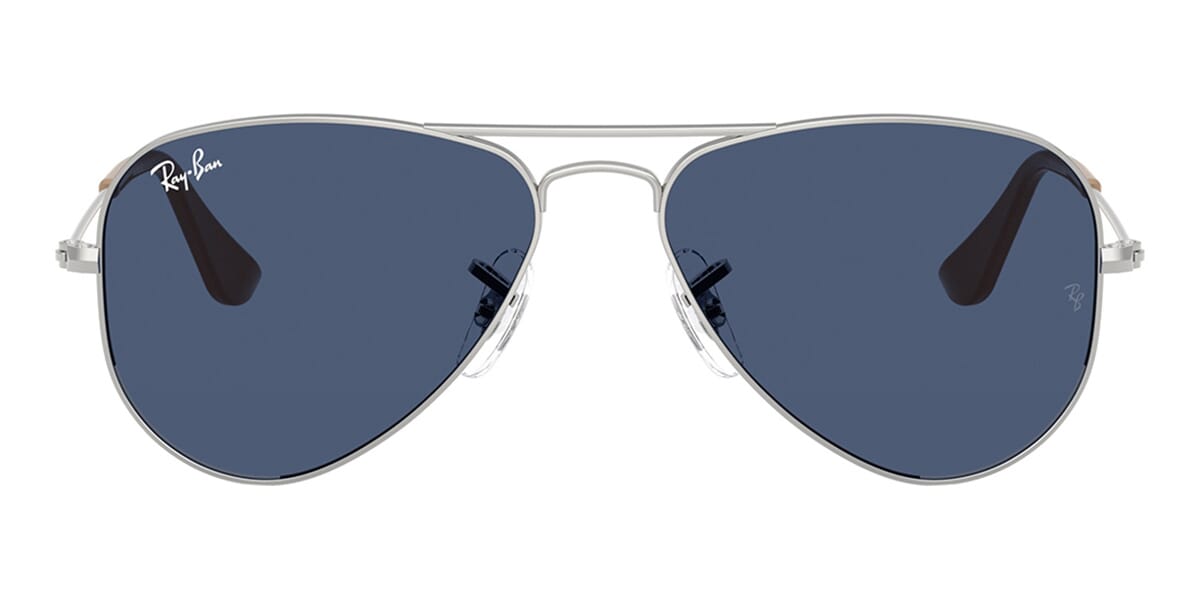 This aviator Ray-Ban sunglass comes in a silver frame with dark blue lenses.