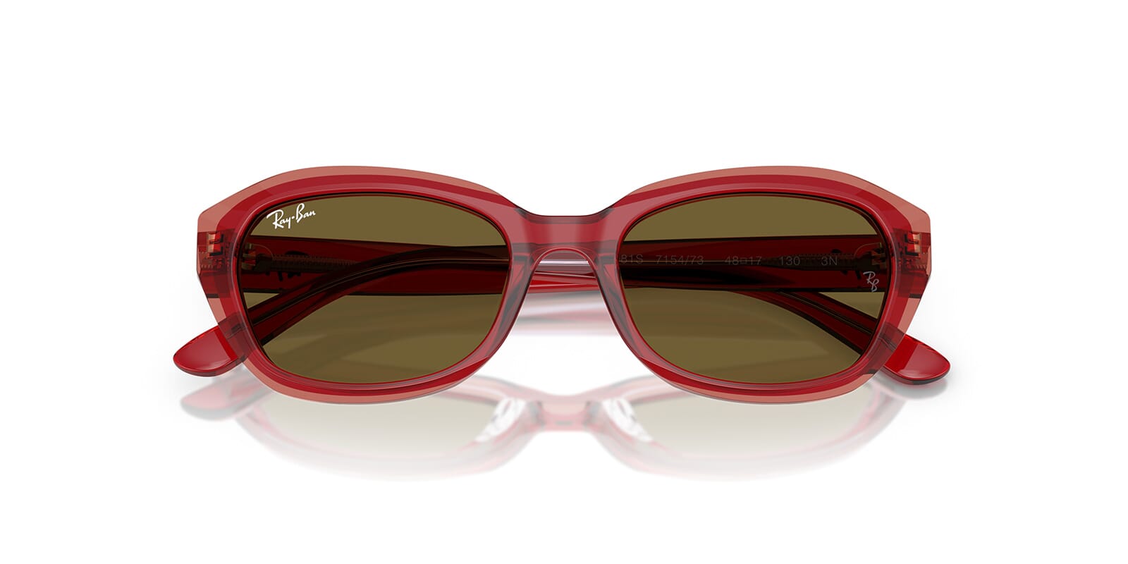 This rectangular Ray-Ban sunglass comes in a red on orange and light purple frame with dark brown lenses.
