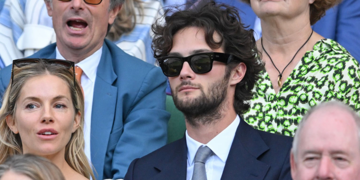 Actor and model Oli Green, pictured with partner Sienna Miller, was seenwearing black Ray-Ban Mega Wayfarer RB 0840S 901/31 sunglasses at the Wimbledon Tennis Championships 2025. Shop online now on Pretavoir