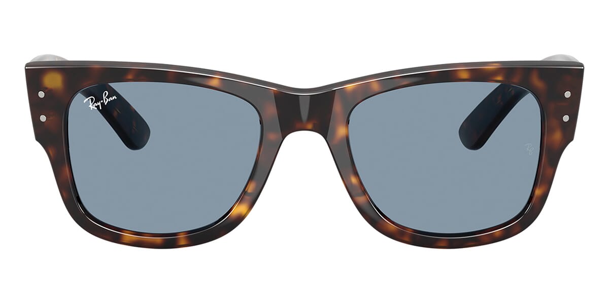 This square Ray-Ban sunglass comes in a havana frame with blue lenses.