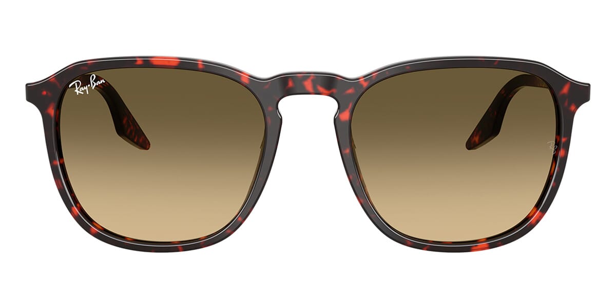 This square Ray-Ban sunglass comes in a havana red tortoiseshell frame with vintage black to brown gradient lenses.