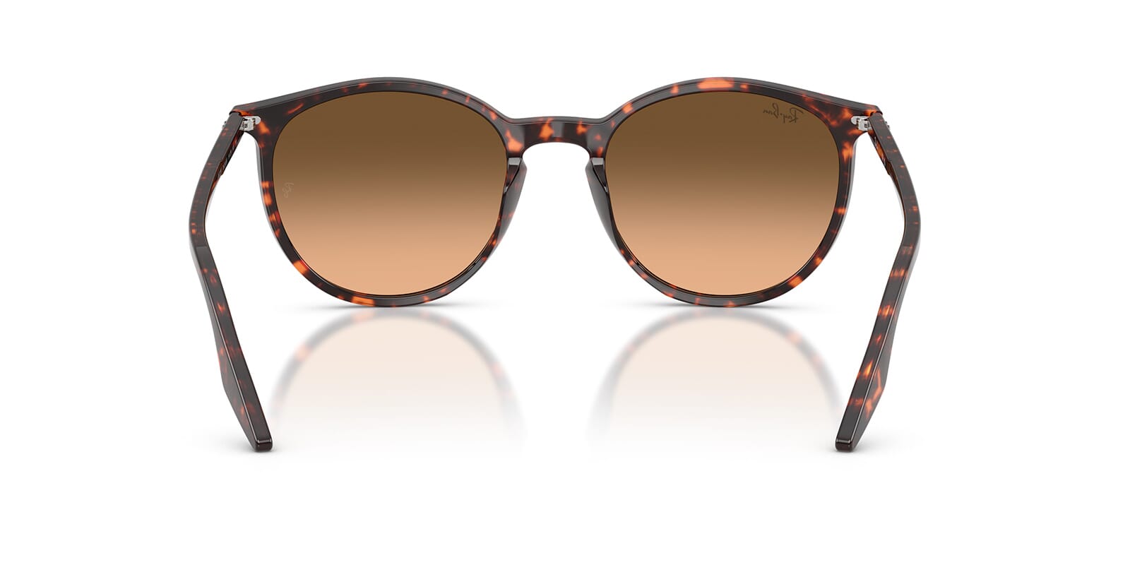 This round Ray-Ban sunglass comes in a havana red tortoise shell frame with dark grey to pink gradient lenses.
