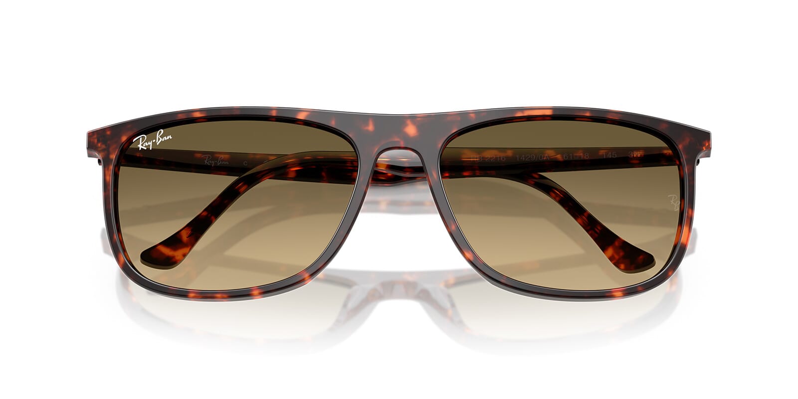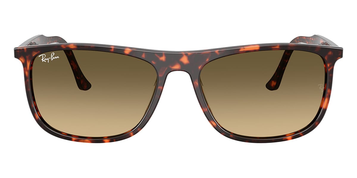 This rectangular Ray-Ban sunglass comes in a havana red tortoise shell frame with black to vintage brown gradient lenses.